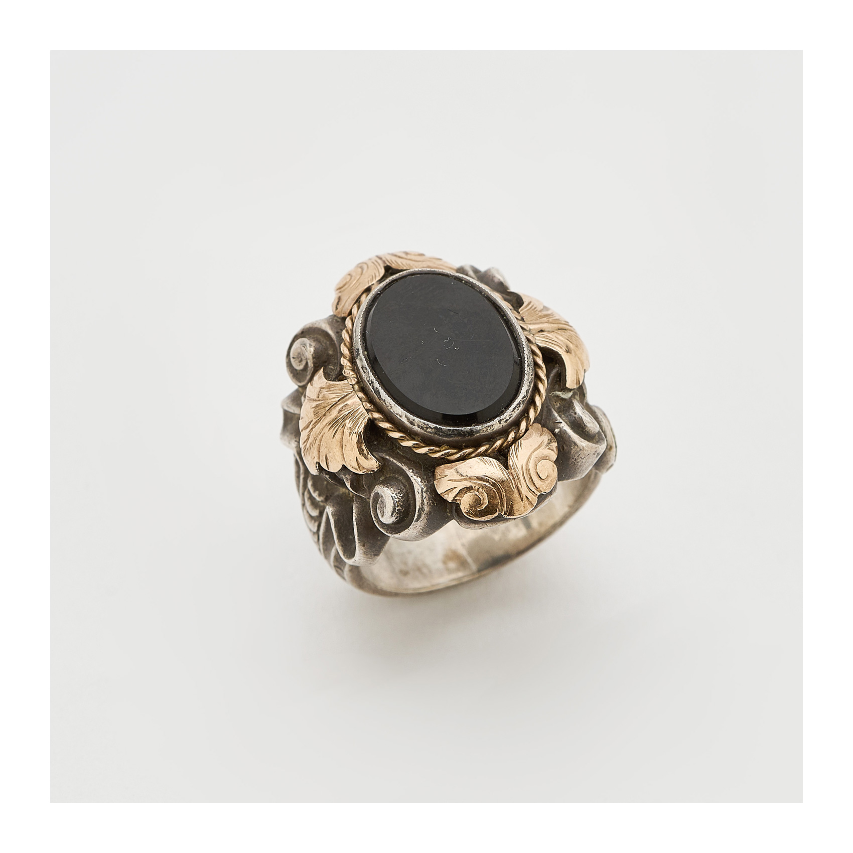 Sortija en plata y vistas en oro con aplicación oval de ónix de 14 x 10 mm.