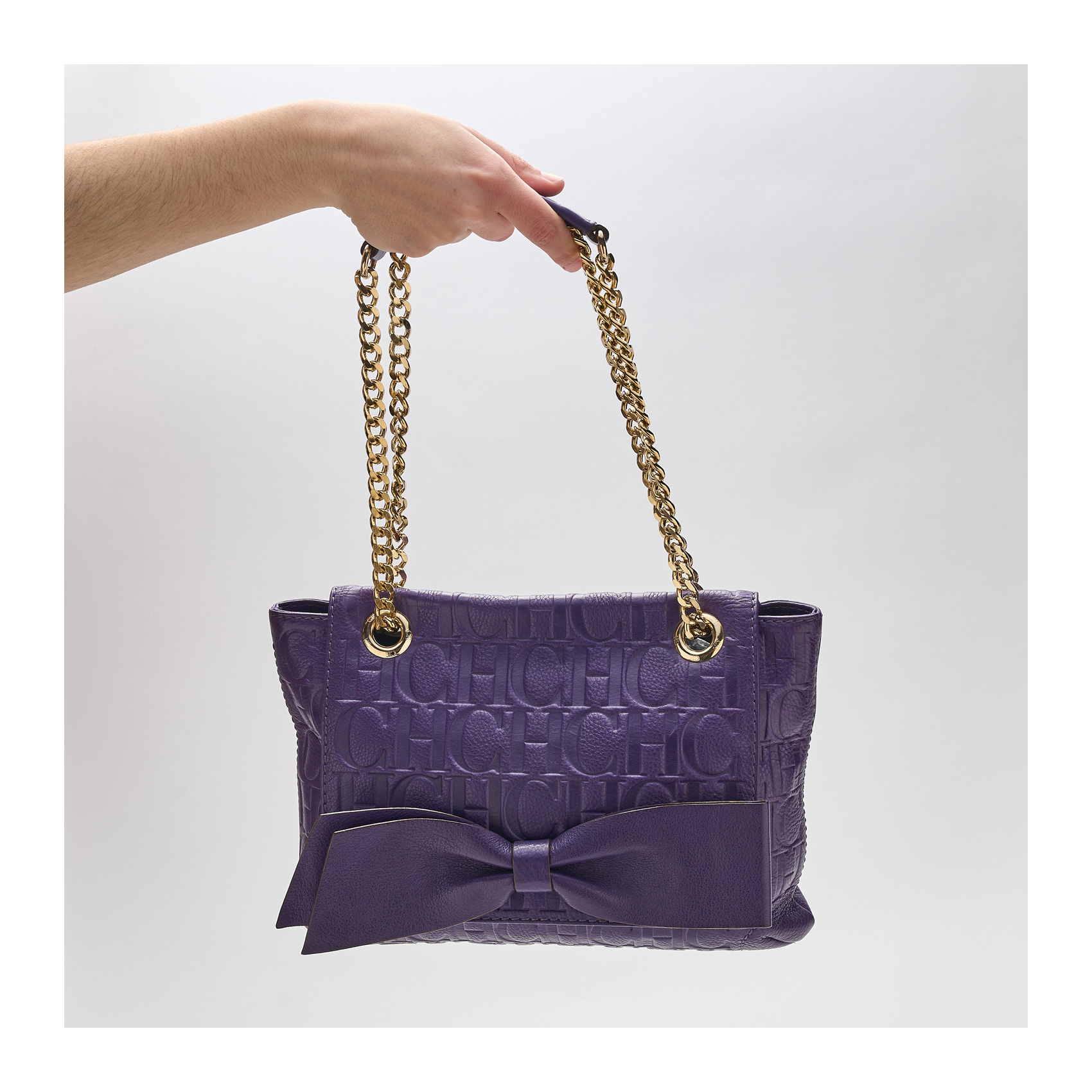 CAROLINA HERRERA. Bolso de hombro modelo «Audrey» en cuero de tonalidad violeta con estampado de monograma de la firma en relieve y lazada decorativa en la solapa. Cadena en metal dorado regulable a dos medidas. Nuevo a estrenar. Adjunta funda dustbag original.