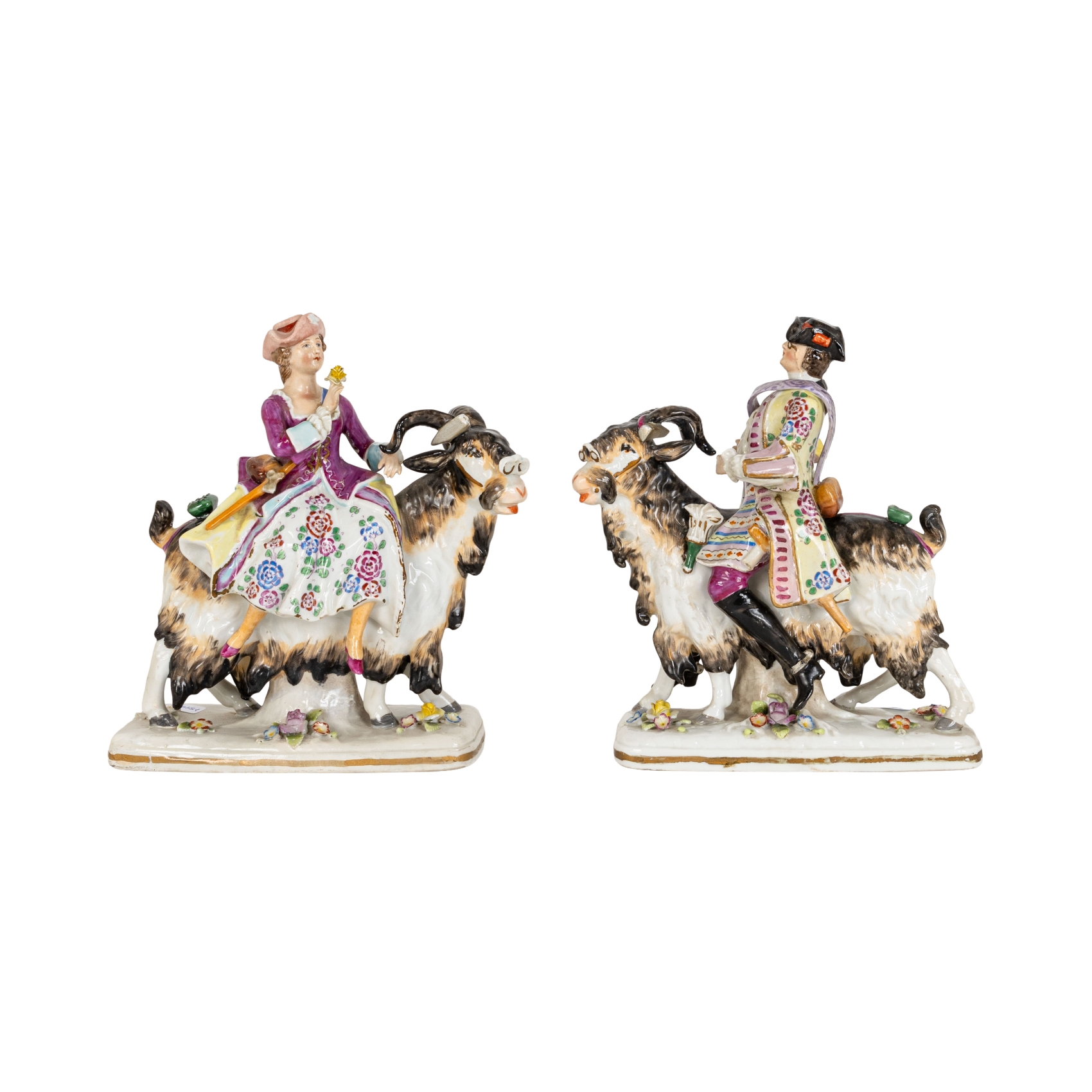 Galantes sobre carneros. Pareja de figuras en porcelana alemana esmaltada, s.XIX. Marcas en la base una.