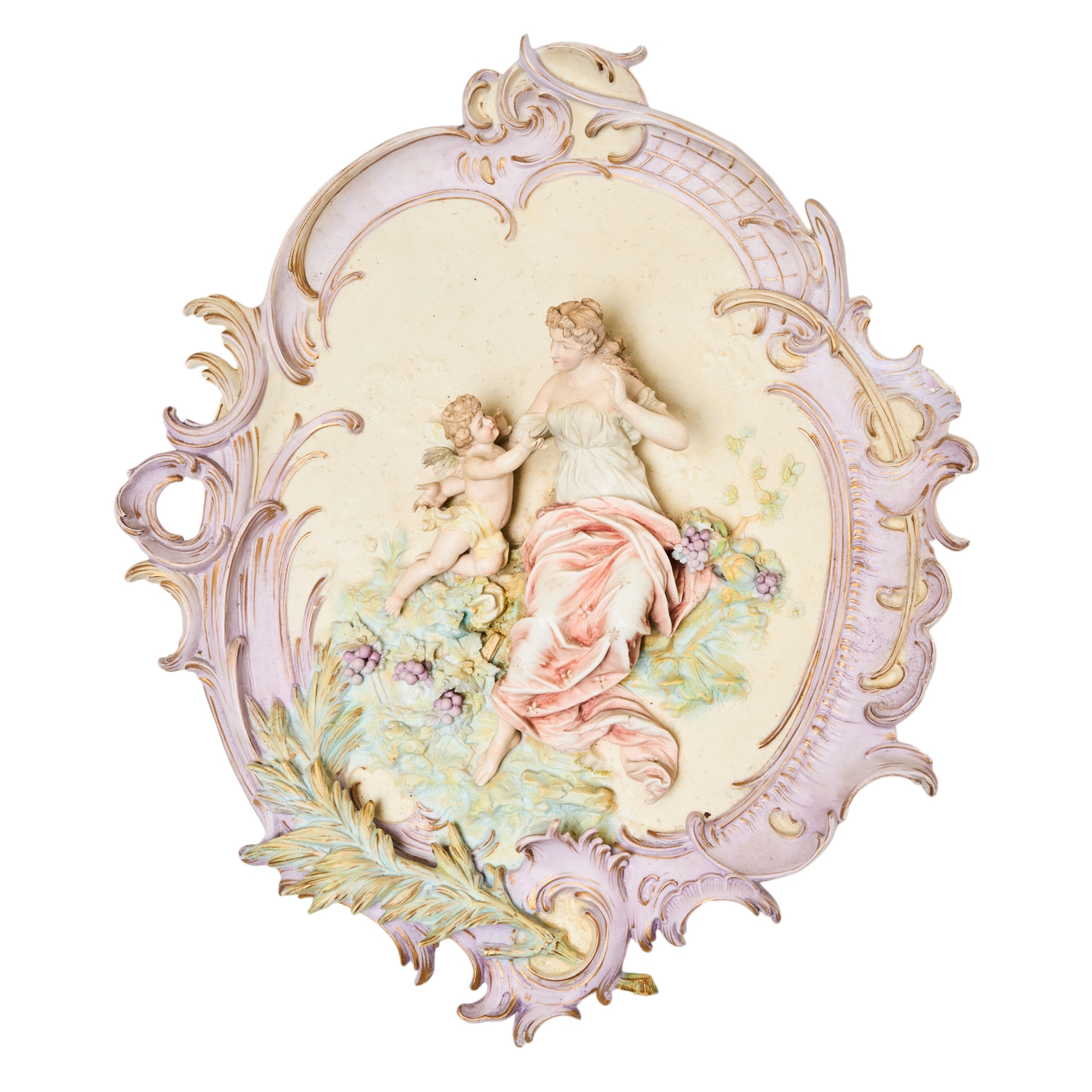 Plafón en biscuit alemán de Volkstedt esmaltado y fileteados al oro fino con decoración de dama y angelote en relieve, fles. del s.XIX. Marcas al dorso.