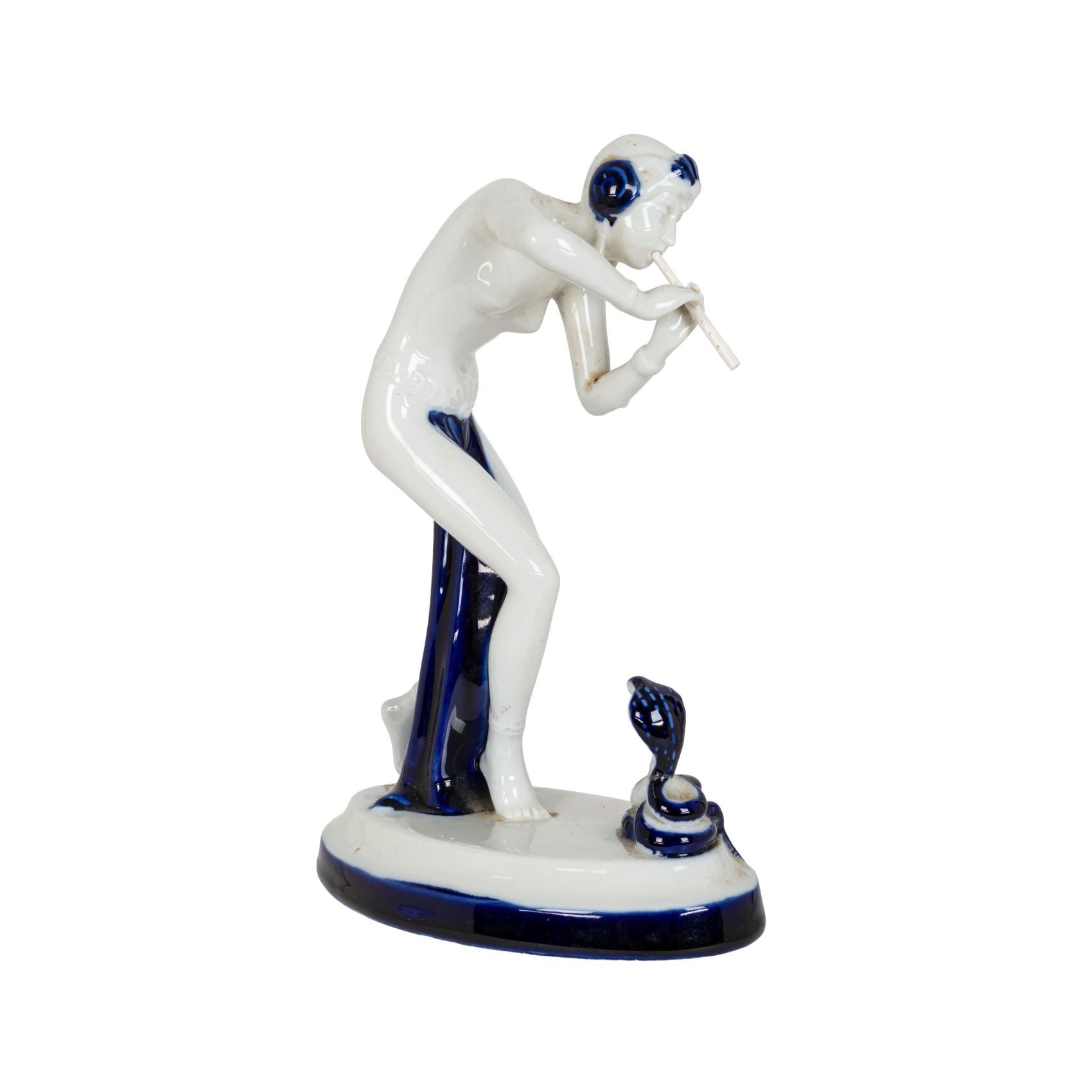 Bailarina exótica. Figura en porcelana checa esmaltada azul y blanca, s.XX. Marcas en la base.