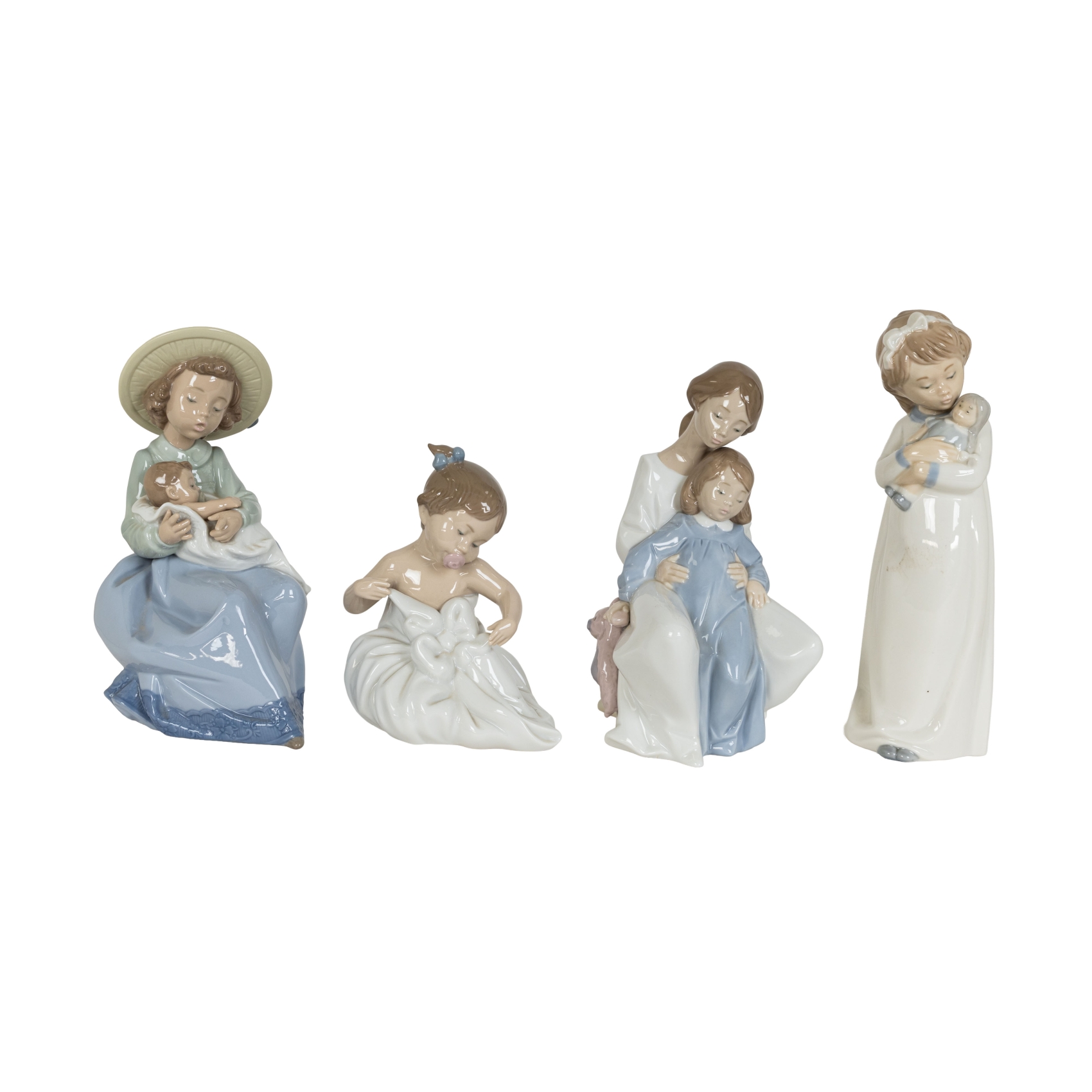 Momentos con mamá, ¡Ya estoy aquí!, Besando a la muñeca y Amor de hermana. Escultores Juan Huerta y Rafael Lozano. Nº02001429, Nº02001337 y Nº02001390. Marcas en la base.