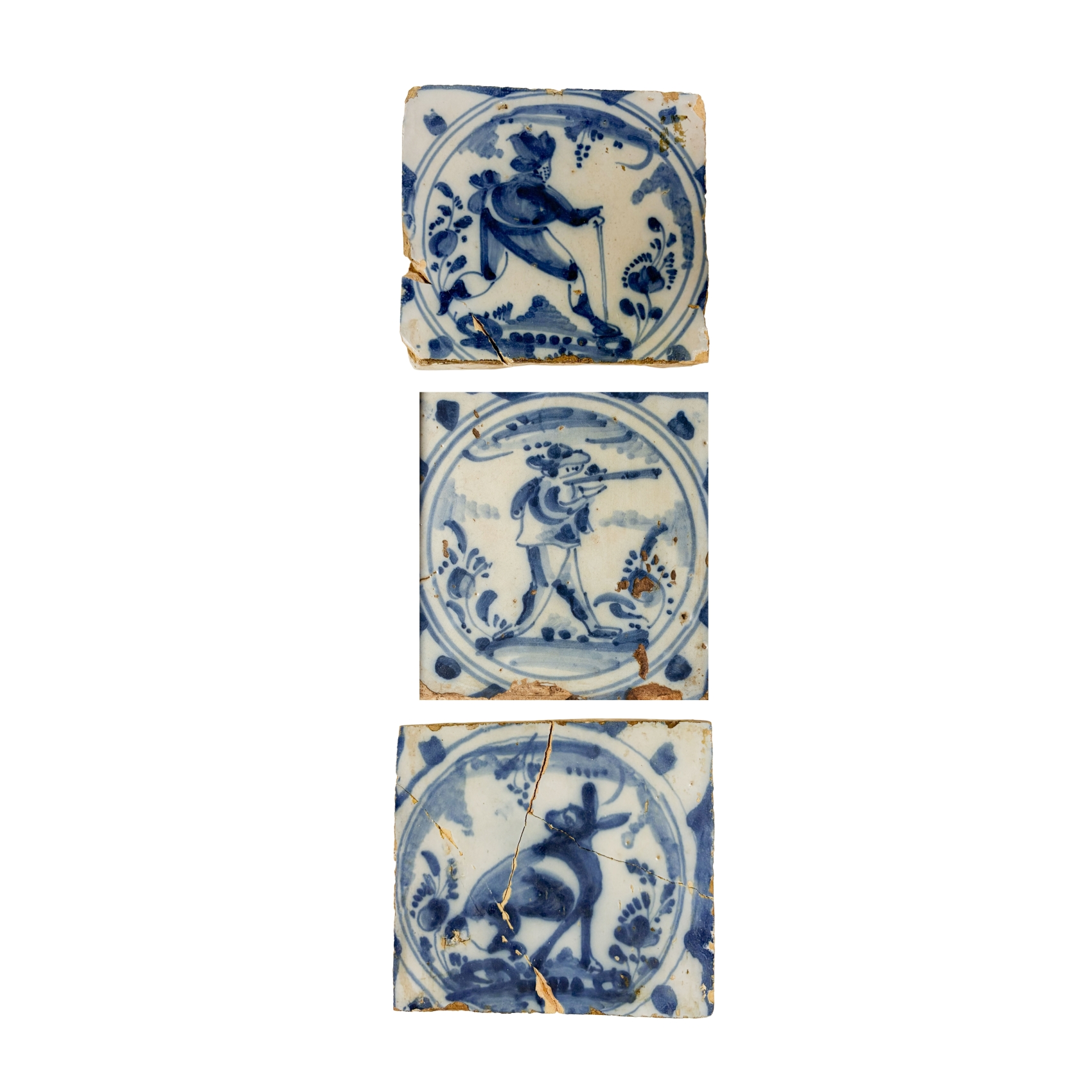 Lote de tres azulejos en cerámica de Triana esmaltada azul y blanca con decoración de cazador y campesino, Sevilla, s.XVIII.