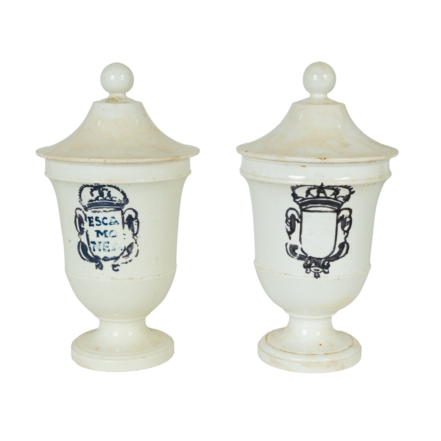 Pareja de albarelos de farmacia en cerámica blanca con cartela esmaltada, fles. del s.XIX.