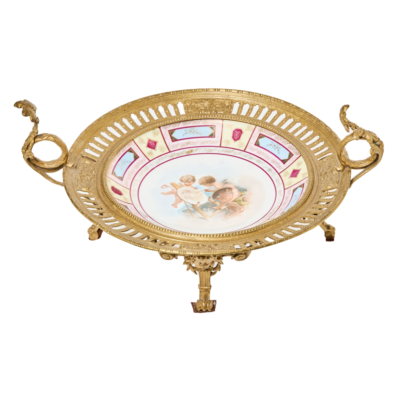 Centro en porcelana francesa con decoración de motivos vegetales y de puttis esmaltados en el asiento, fles. del s.XIX. Montura en bronce dorado. Asas con decoración de acantos. Marcas en la base.