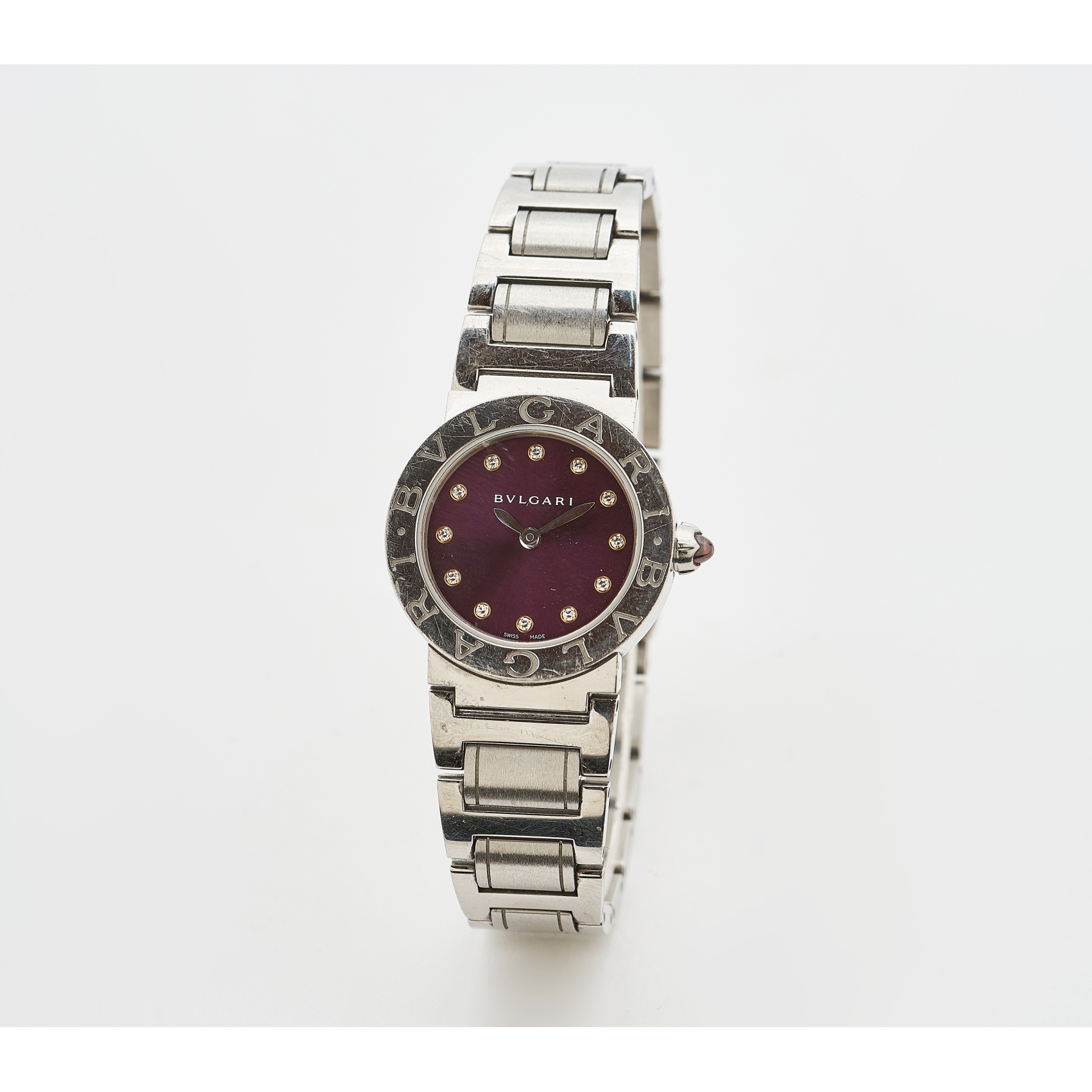 BVLGARI. Reloj de pulsera para señora en acero. Ref./Nº BBL 26 S-PO10850. Esfera en tonalidad malva con doce diamantes talla brillante y un cabujón de cuarzo rosa en la rosca.