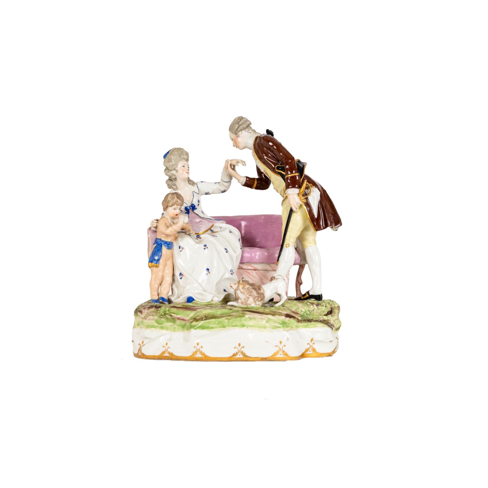 Escena de cortejo. Grupo en porcelana europea esmaltada con representación de pareja dieciochesca con fileteados al oro fino, s.XX.