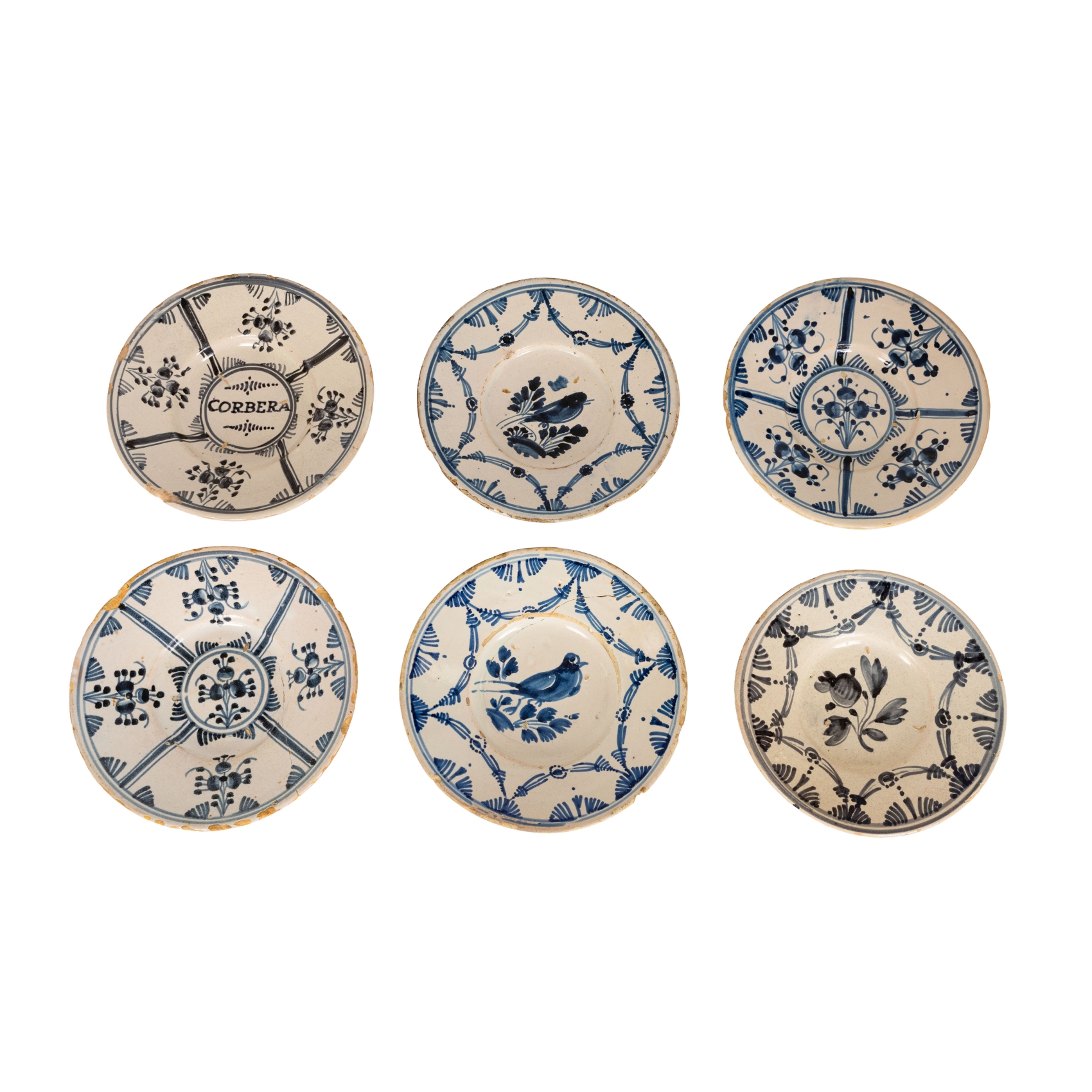 Lote de seis platos en cerámica catalana azul, negra y blanca de la serie «cirereta» con decoraciones florales y de aves, fles. del s.XVIII-ppios. del s.XIX.