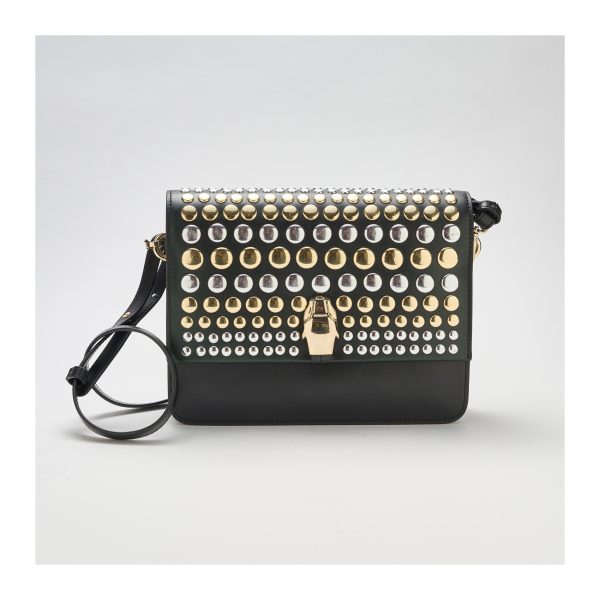CAVALLI CLASS. Bolso bandolera modelo «Honduras» en piel de becerro de tonalidad negra con cierre imantado y decoración de tachuelas y cabeza de pantera en metal dorado y plateado en la solapa. Nuevo a estrenar con plásticos protectores. Presenta levísimo roze en el interior. Adjunta funda dustbag original.