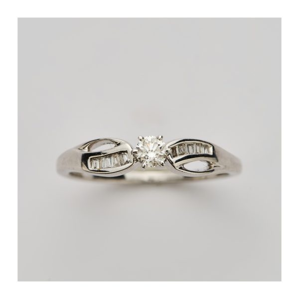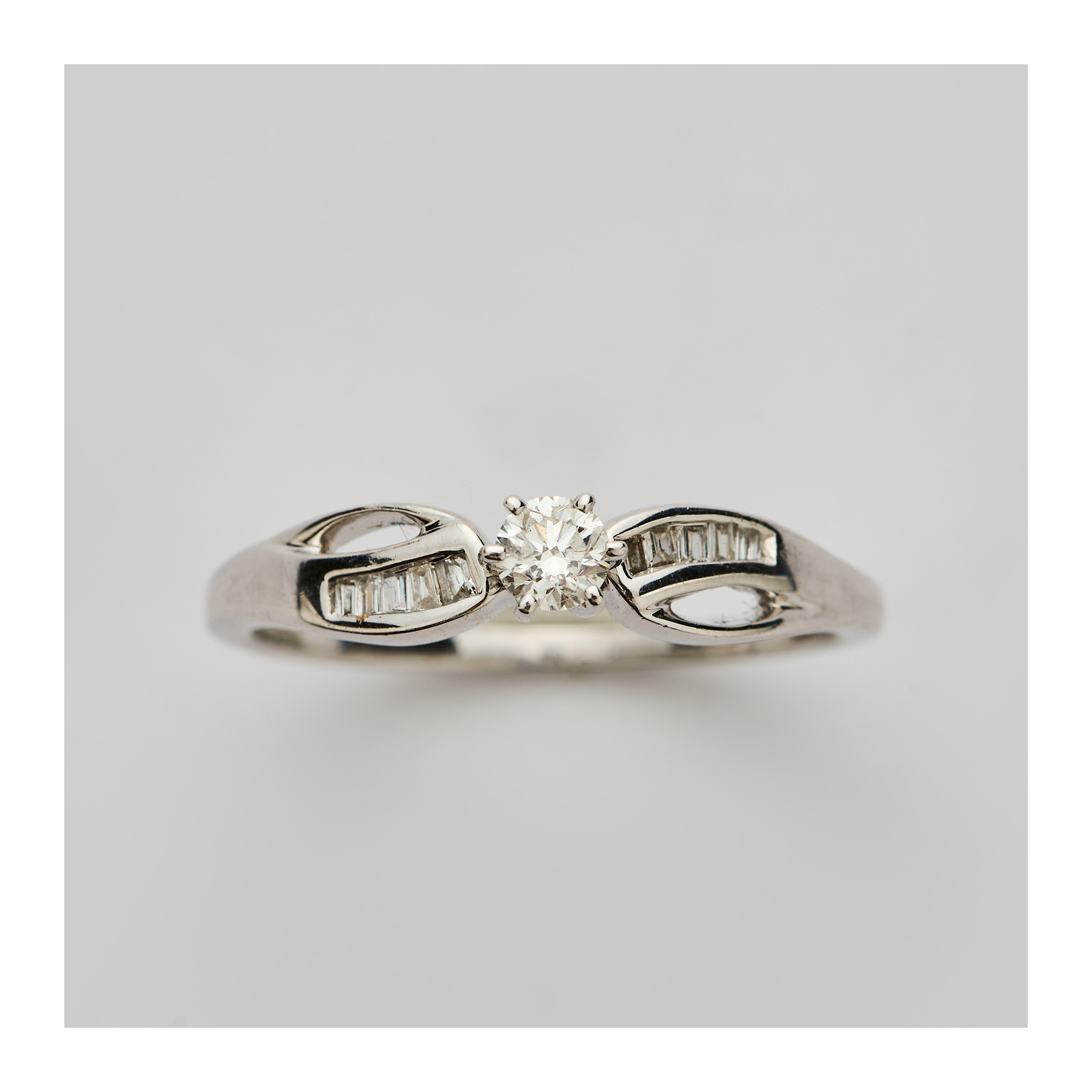 Sortija en oro blanco con diamante central talla brillante engastado en garras y brazos calados con diamantes talla trapecio engastados en carril.