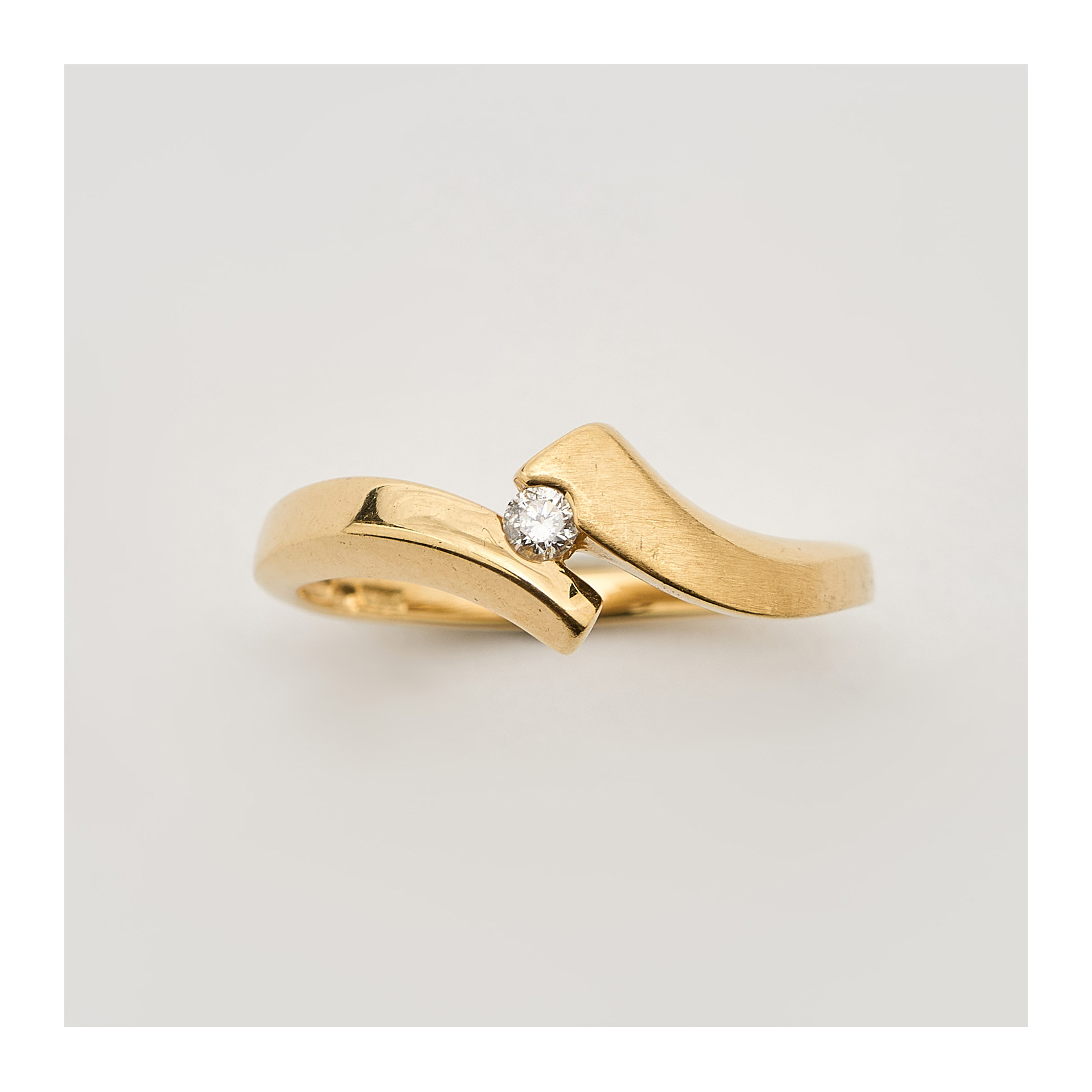 Sortija diseño cruzado en oro mate y brillo con diamante talla brillante.