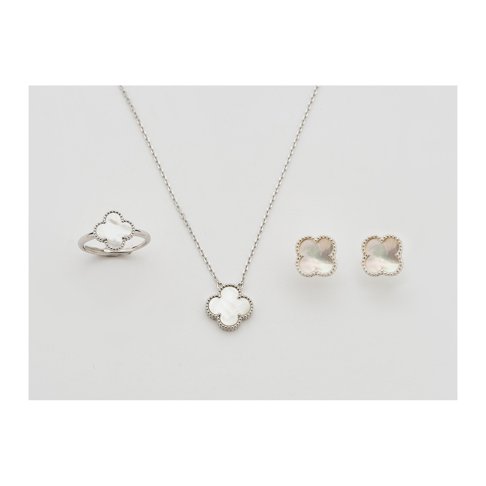 Juego de gargantilla, pendientes y sortija estilo Van Cleef en plata y nácar.