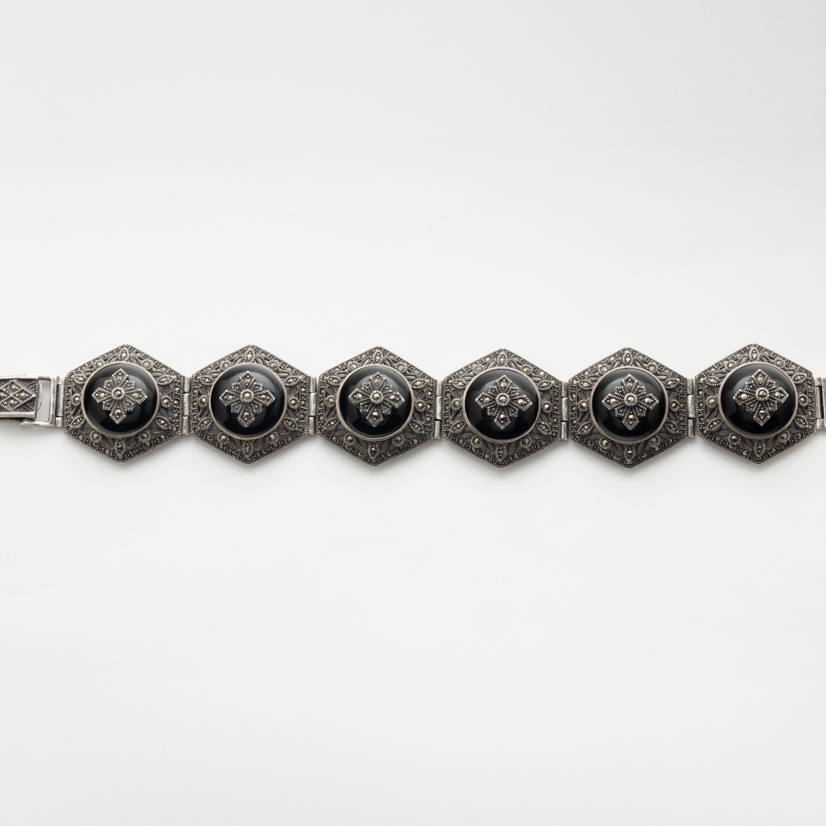 Pulsera estilo Art Déco en plata compuesta por seis eslabones exagonales articulados entre sí y decorados con filigrana, cabujón central de ónix y marquesitas.