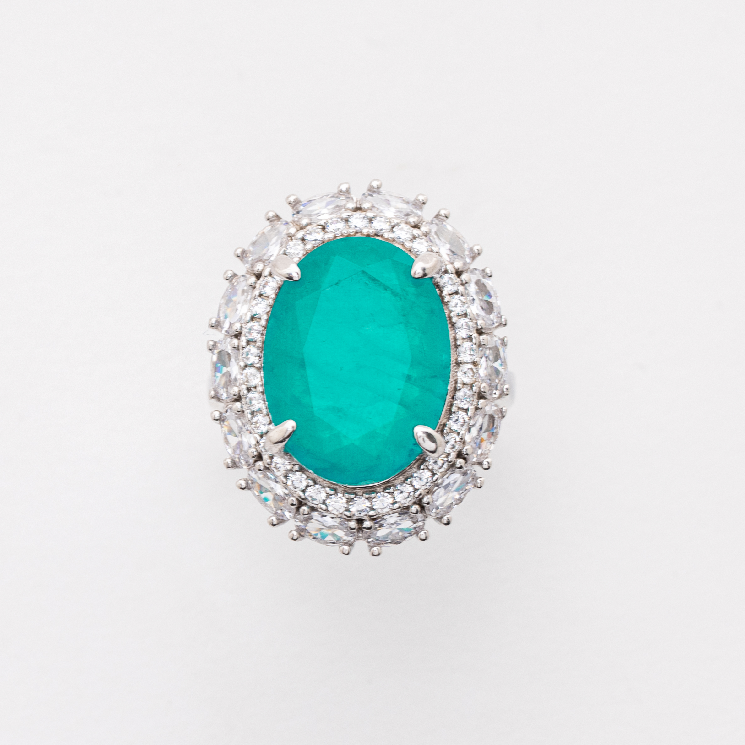 Sortija rosetón en plata rodiada con piedra ornamental talla oval en color verde de 16 x 12 mm y doble orla de circonitas tallas brillante y oval.