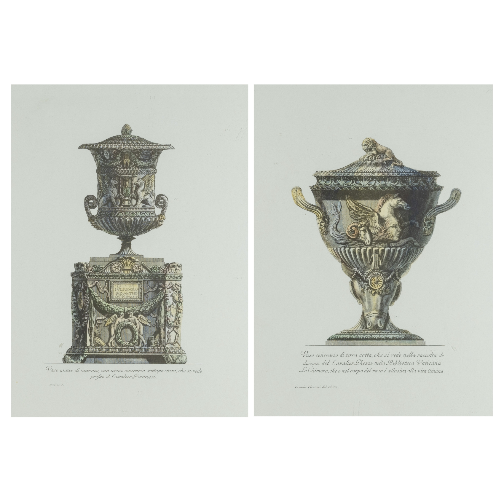 Pareja de grabados al aguafuerte sobre papel. Publicados originalmente en el libro «Vasi, candelabri, cippi, sarcofagi, tripodi, lucerne et ornamenti antichi» publicado en 1778.