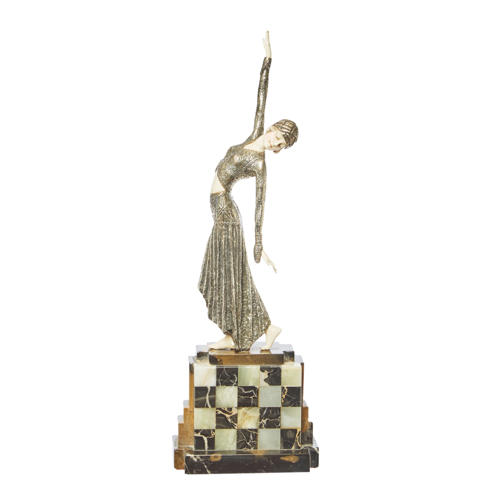 Escultura crisoelefantina estilo Art Deco en bronce esmaltado con carnaciones en marfil. Apoya sobre peana en ónix y mármol portoro. Firmada. Adjunta certificado Cites.