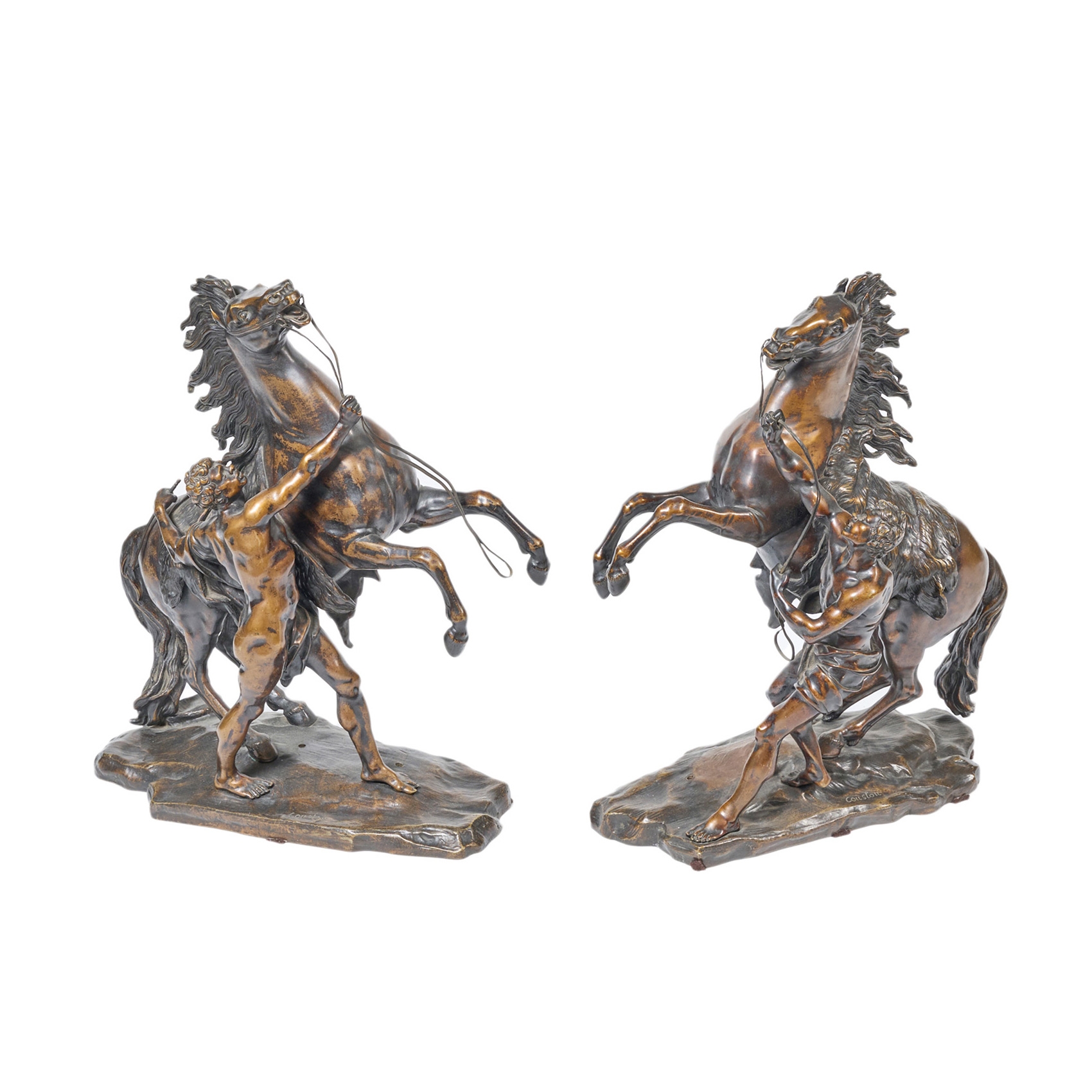 Pareja de esculturas en bronce patinado. Firmadas. Según las realizadas a gran escala, por el mismo autor, en mármol de Carrara para la entrada al parque del Palacio de Marly. Actualmente custodiadas en el Museo del Louvre, París, Francia.