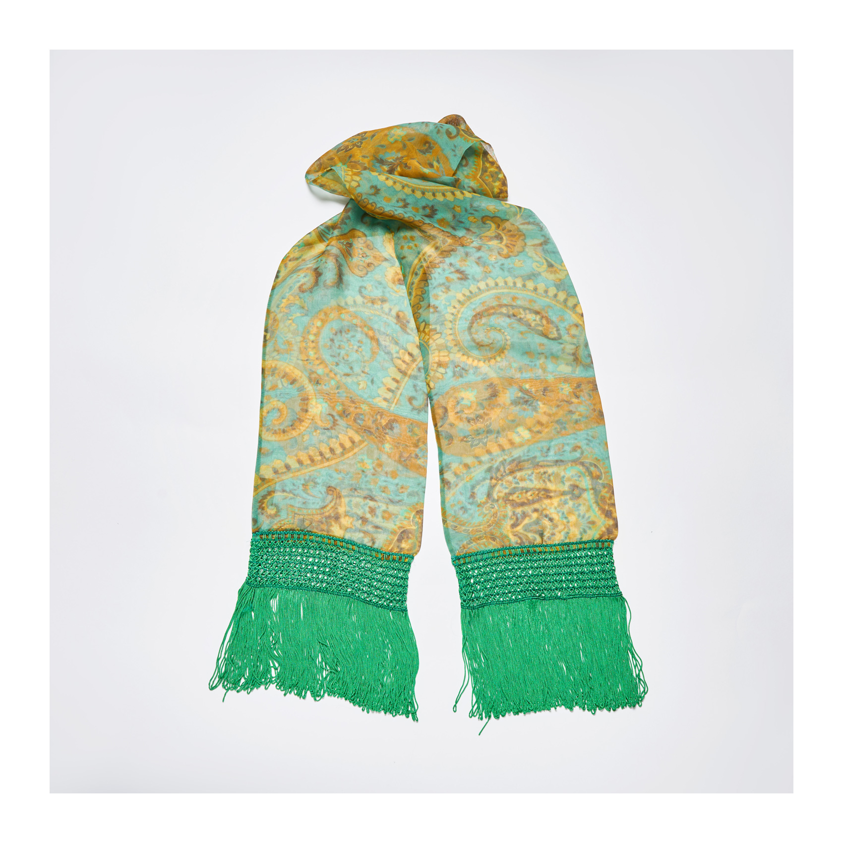 DOLCE & GABBANA. Estola en seda de tonalidad verde y ocre con estampado de motivos barrocos rematado por enrejado con flecos. En perfecto estado.