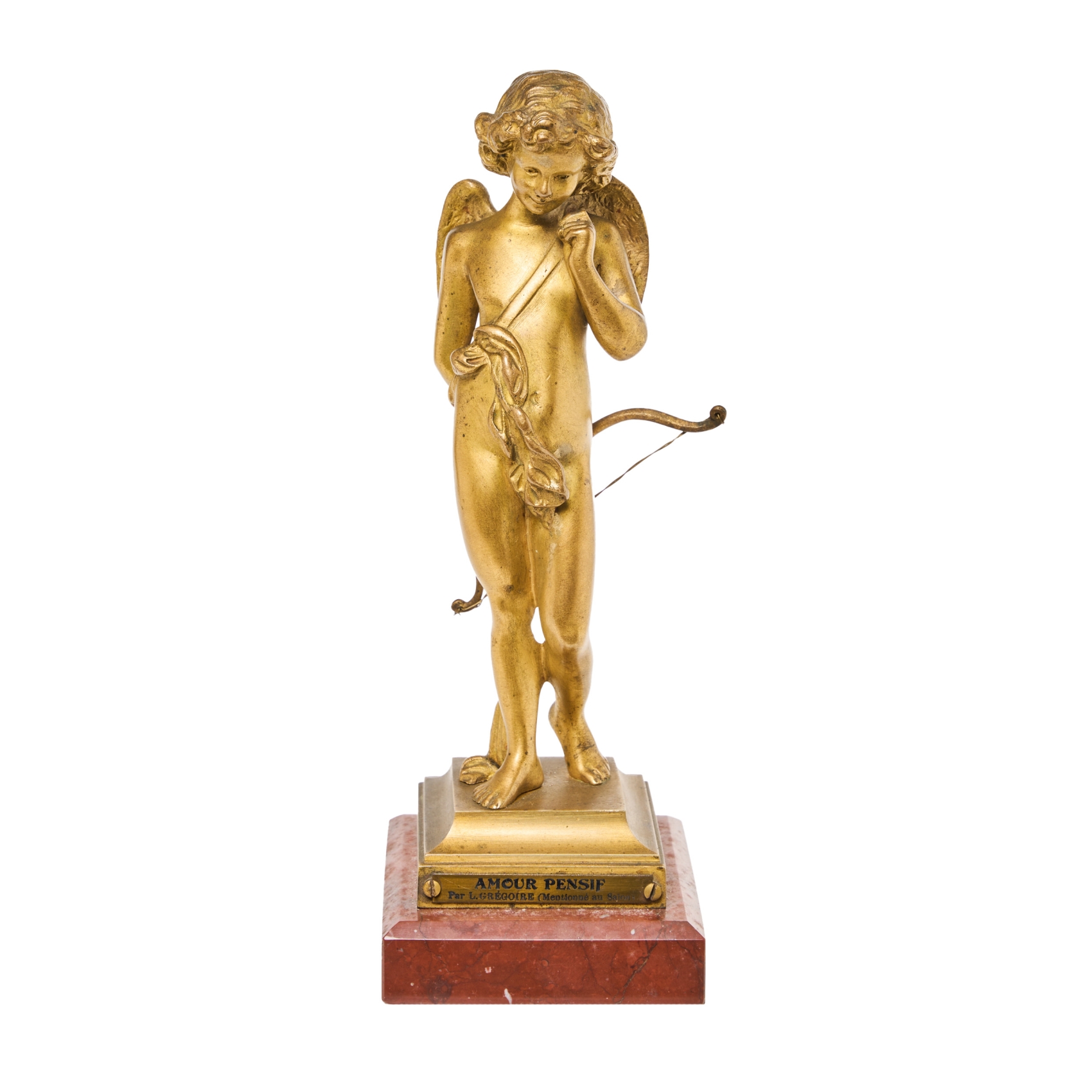 Escultura en bronce dorado sobre peana en mármol rojo veteado.