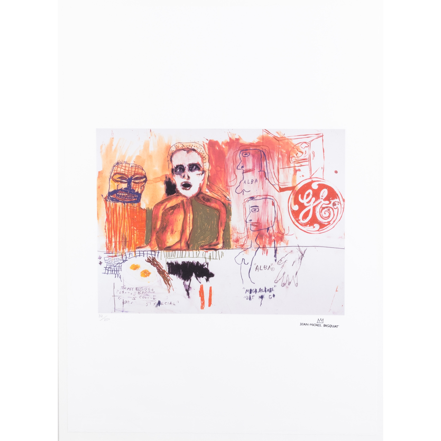 Litografía sobre papel. Firmado en plancha y numerado 32/250 a lápiz. Sello timbrado de la fundación Basquiat.