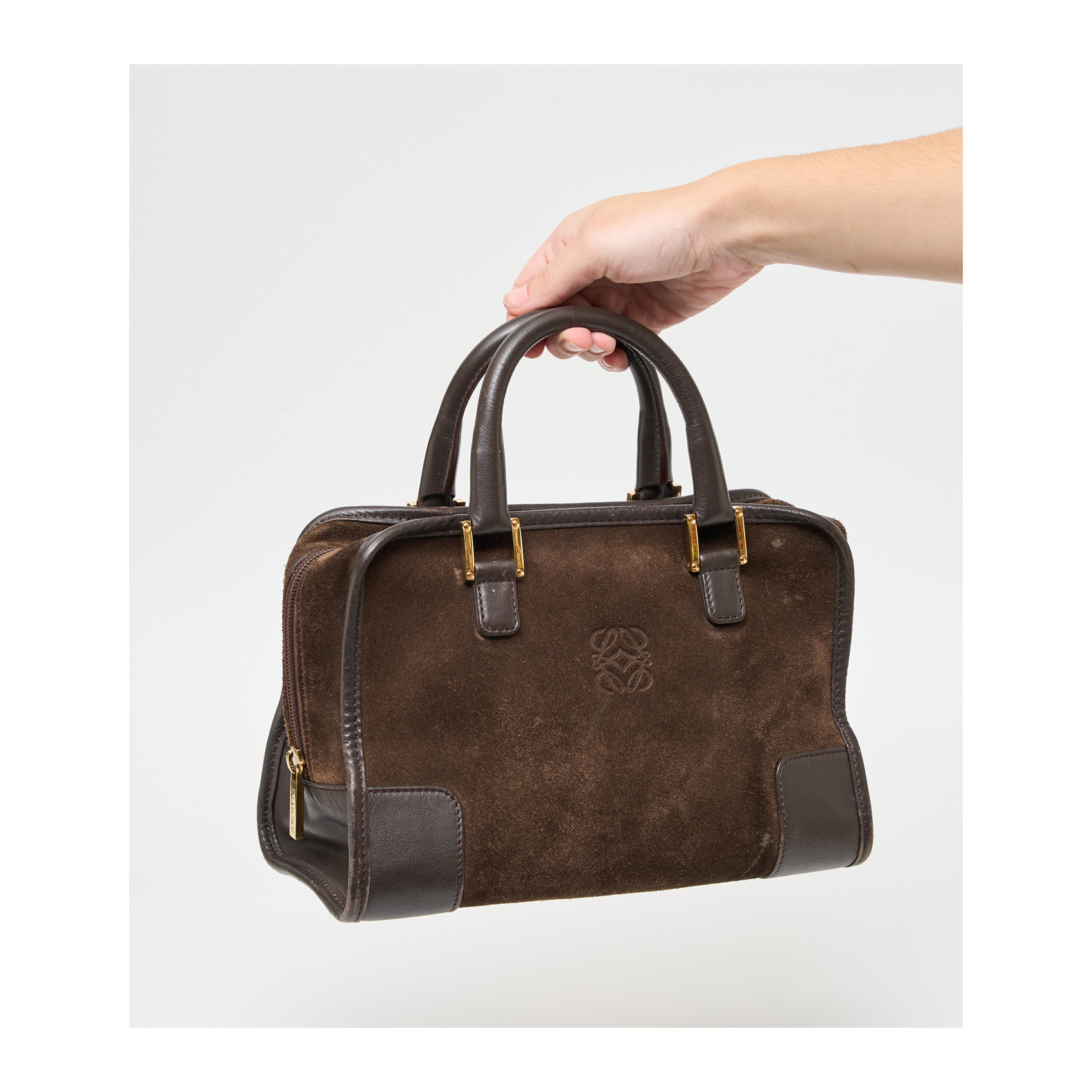 LOEWE. Bolso de mano modelo «Amazona» en ante de tonalidad marrón oscuro con detalles y asa en piel con anagrama de la firma al centro. Cierre de cremallera con herrajes metálicos en dorado. En buen estado. Presenta signos de uso.