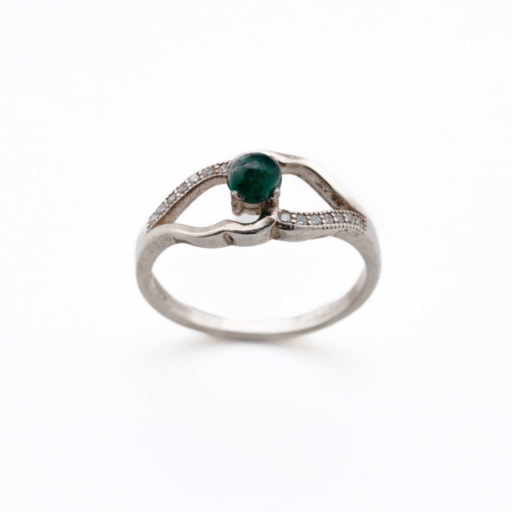 Sortija en plata con cabujón de esmeralda y circonitas.
