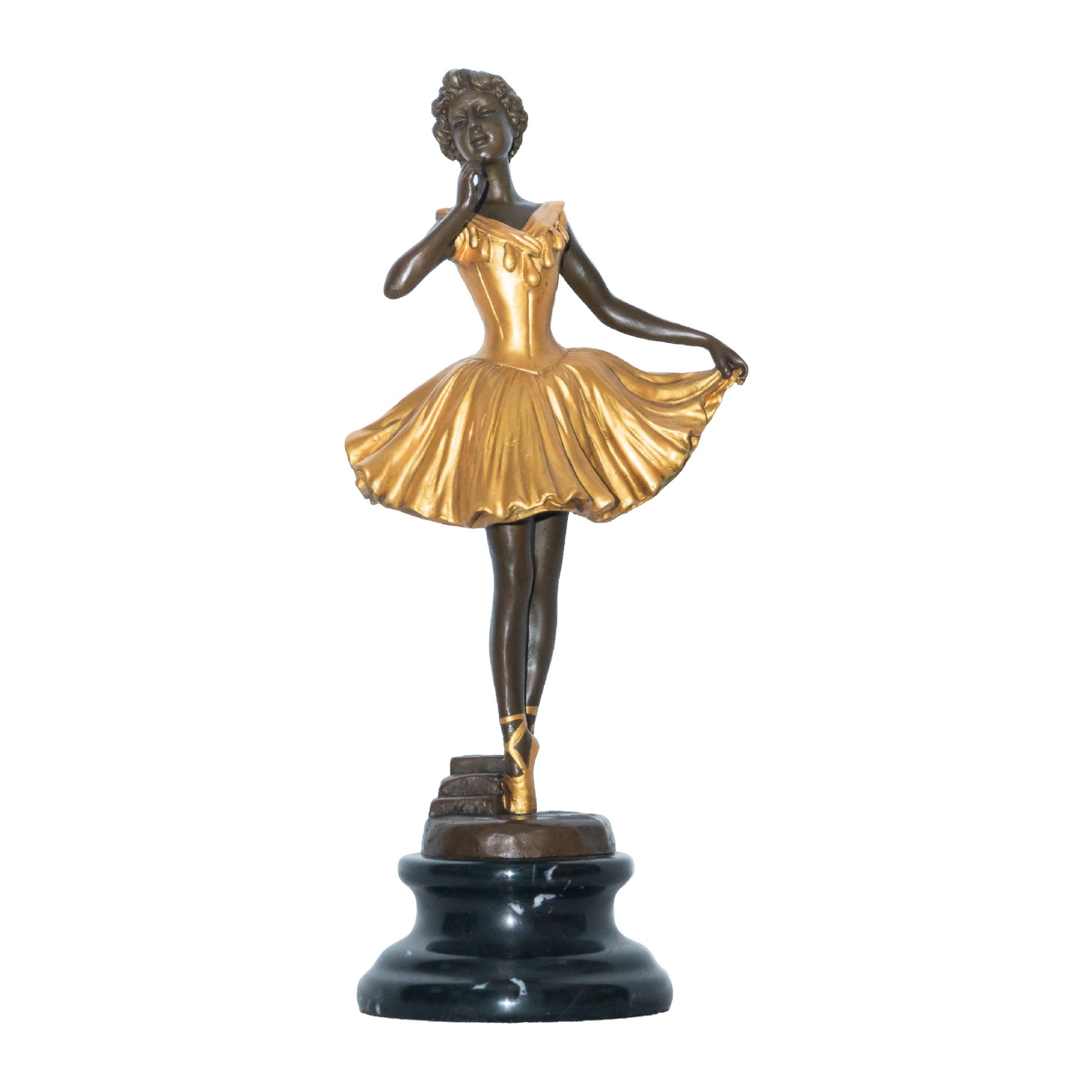Escultura en bronce patinado y dorado sobre peana en mármol negro. Firmada.