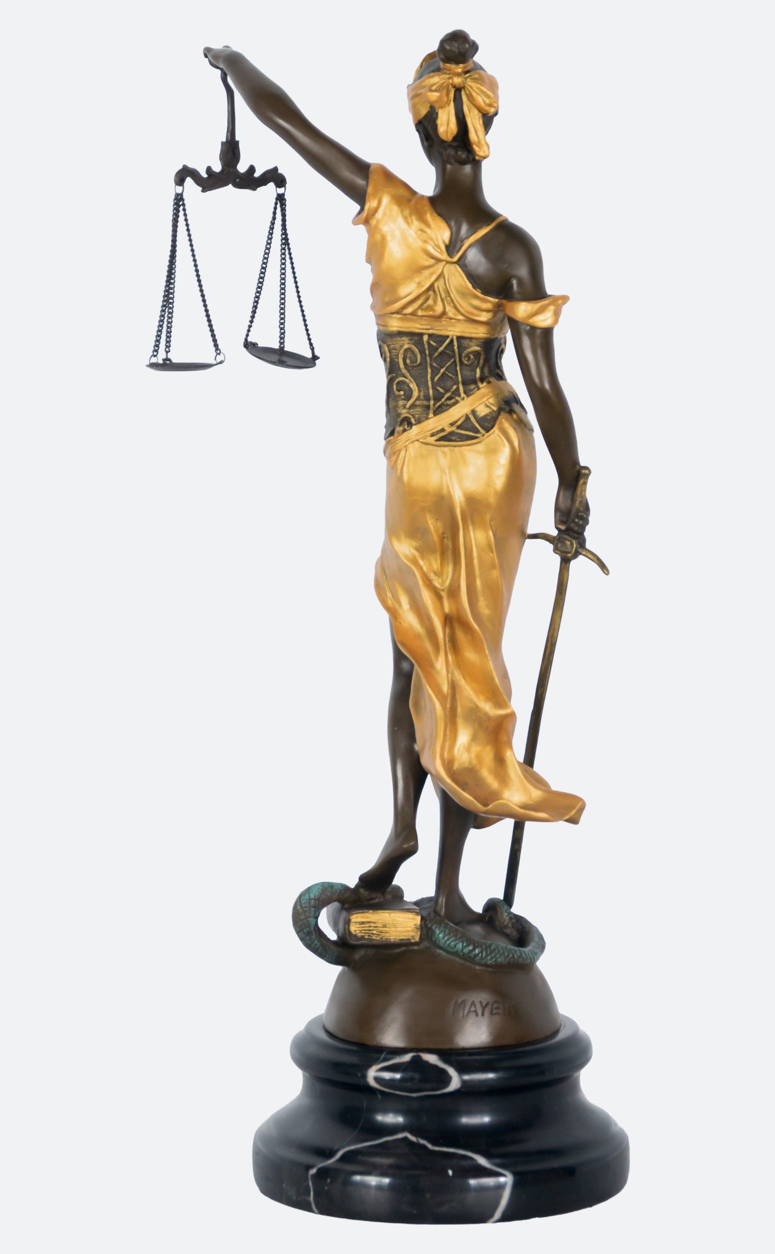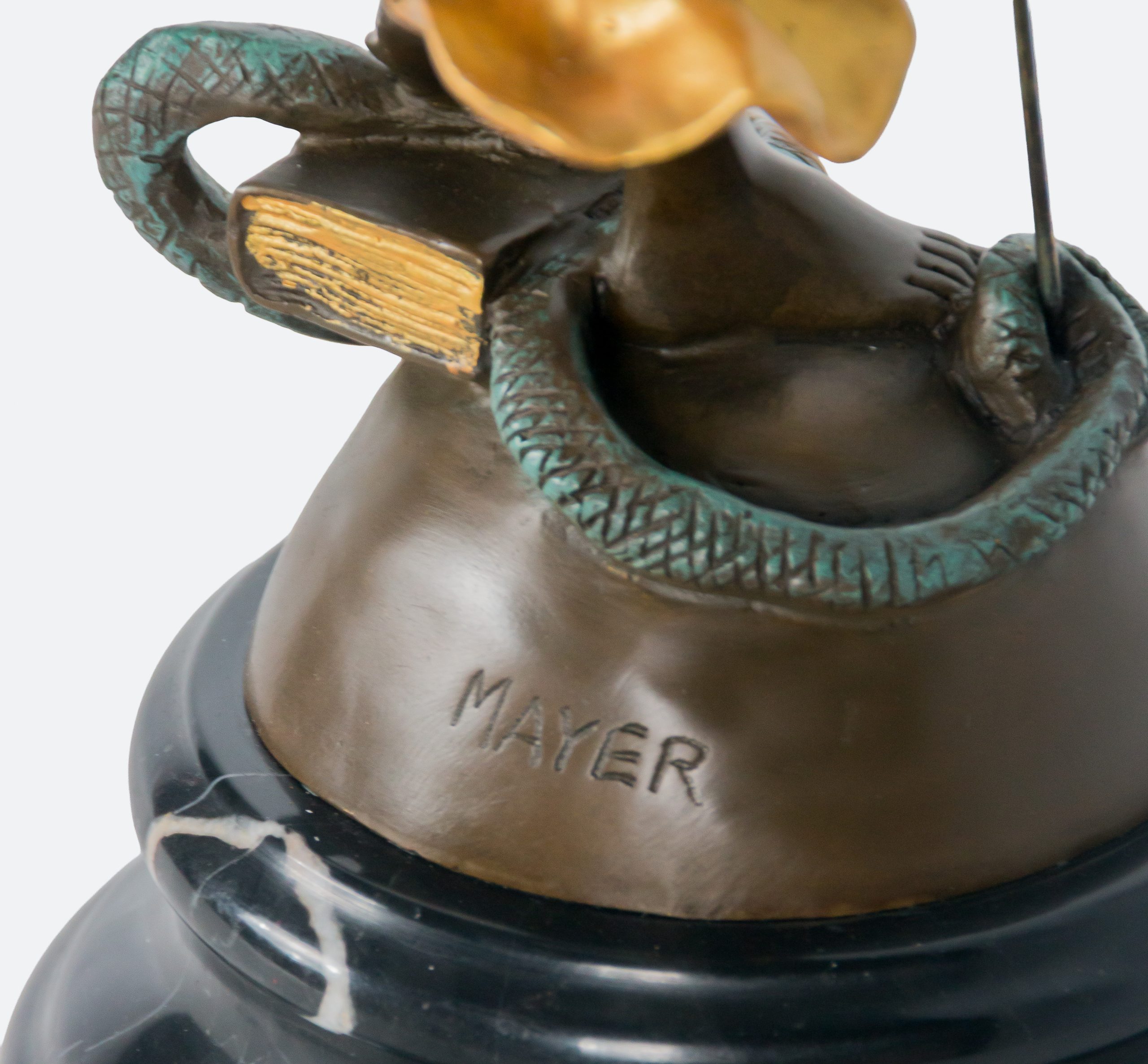 Escultura en bronce patinado y dorado sobre peana en mármol negro. Firmada.
