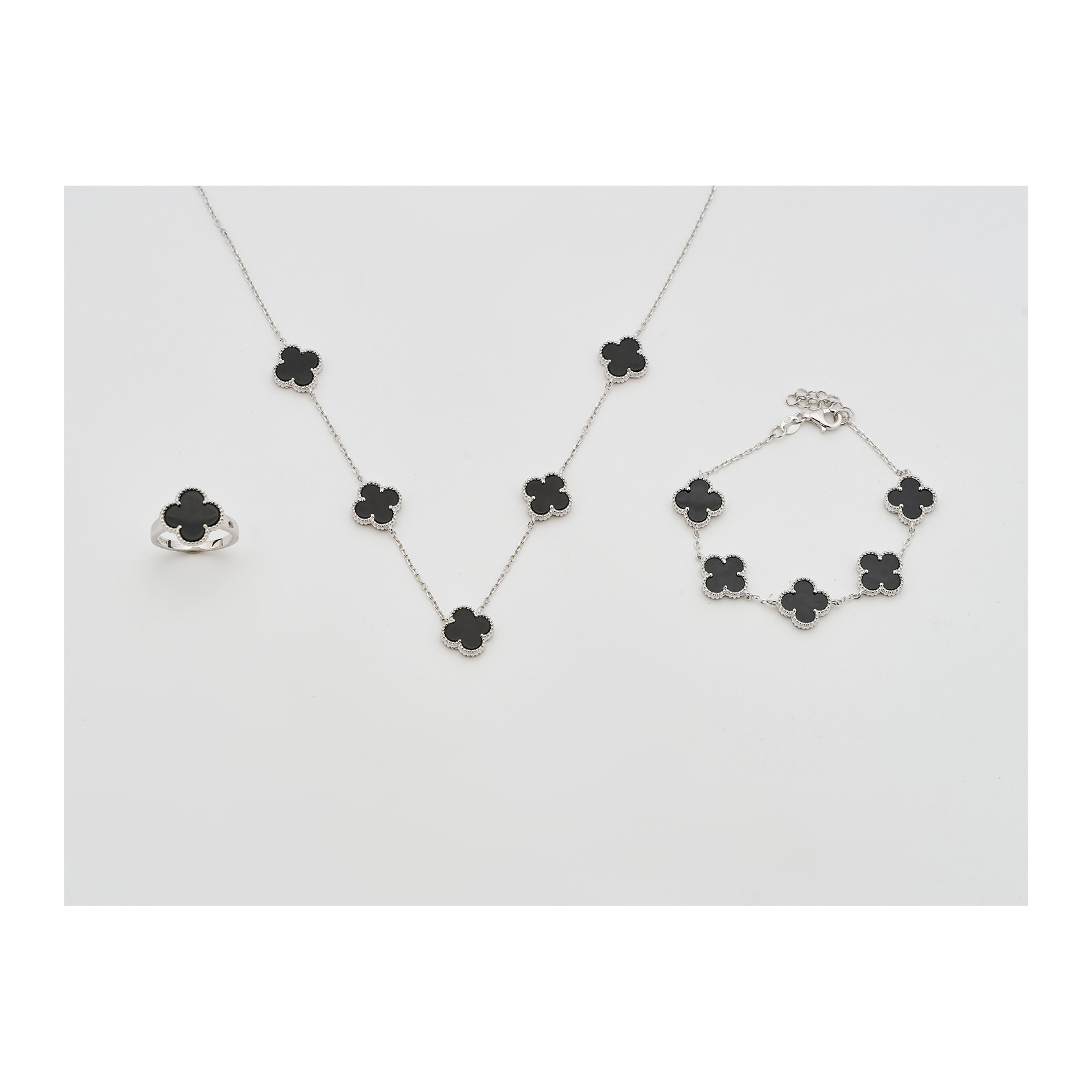 Juego de gargantilla, pulsera y sortija diseño Van Cleef en plata y ónix.