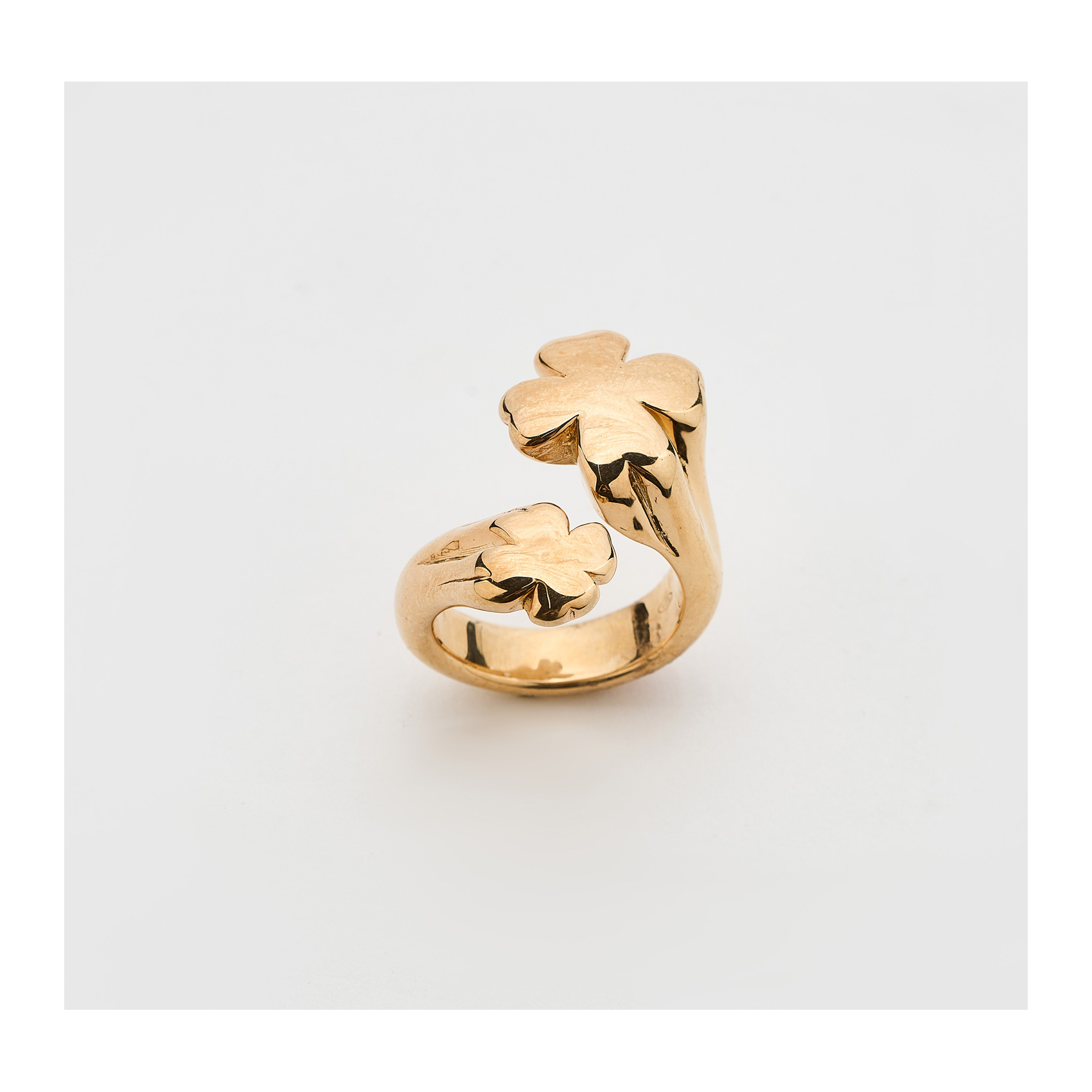 Sortija en plata dorada con centro abierto y rematado por tréboles.