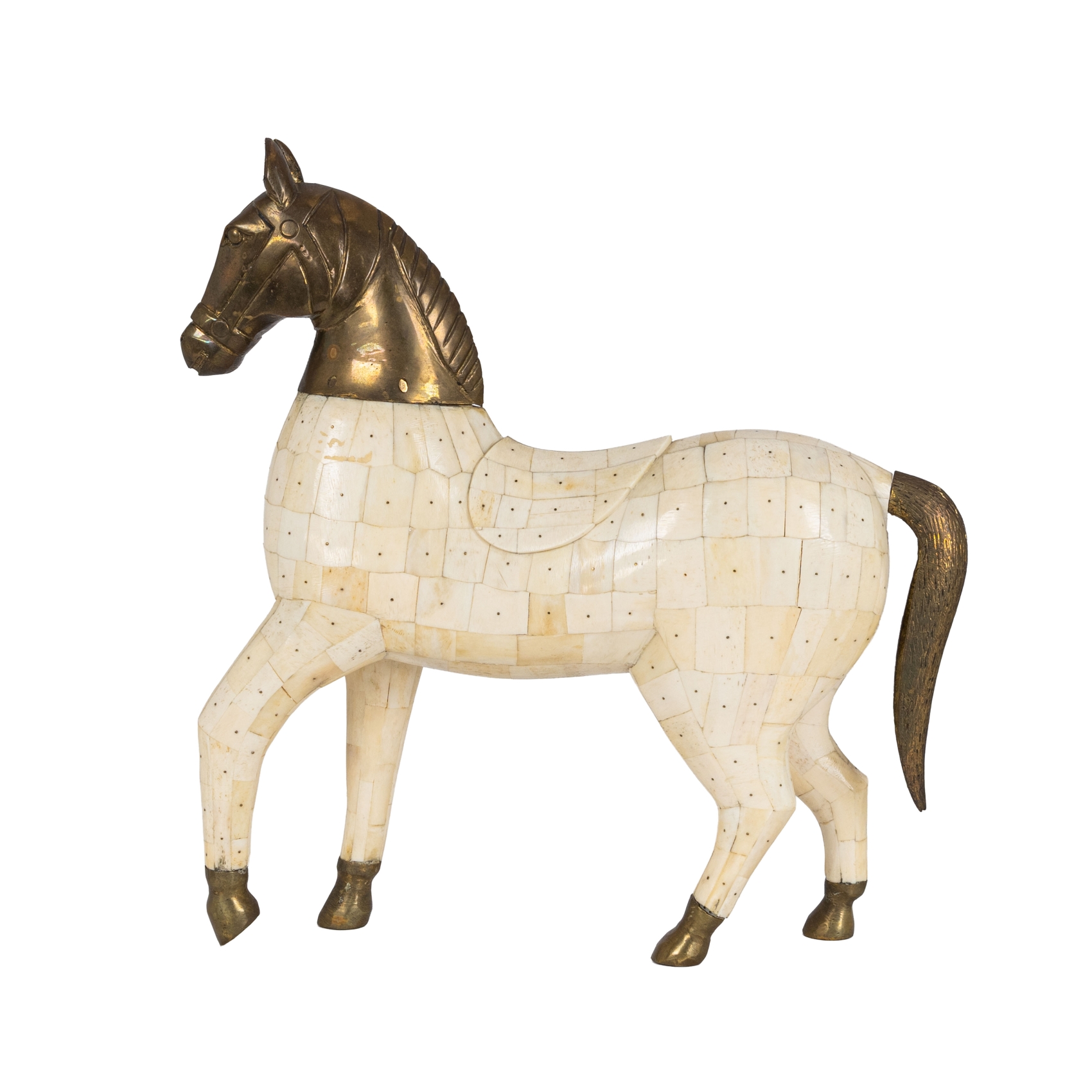 Caballo oriental con cabeza, cola y remates de las patas en bronce dorado y cuerpo en plaqué de hueso, ppios. del s.XX.