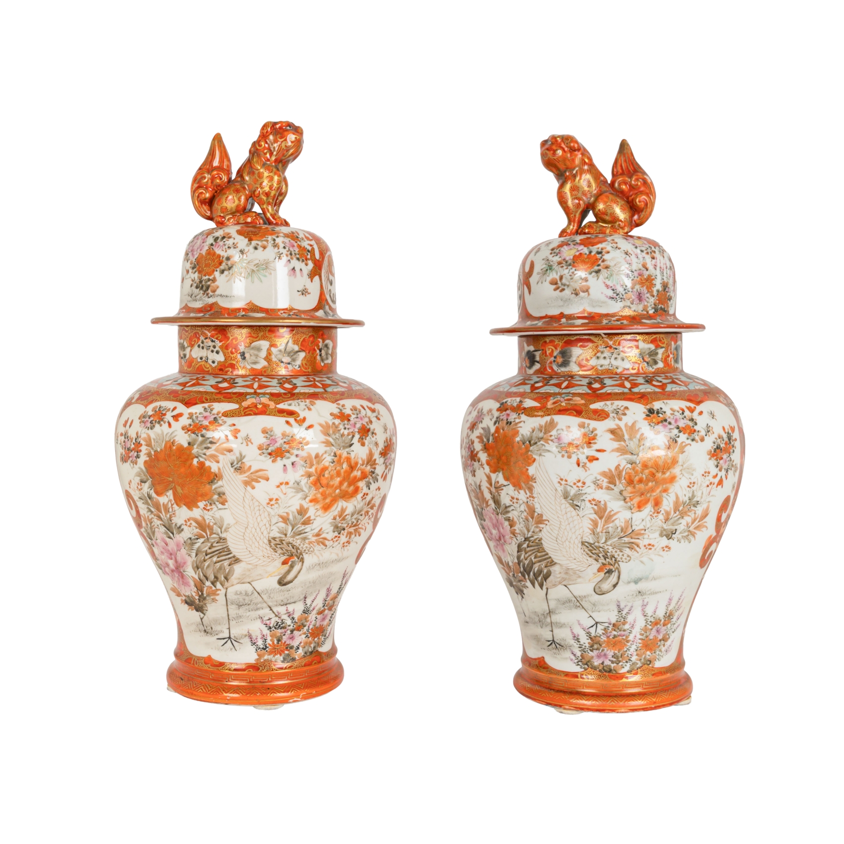 Pareja de tibores en porcelana japonesa de Kutani con con decoraciones esmaltadas de motivos florales y aves en cartelas, ppios. del s.XX. Tapas coronadas por furias.