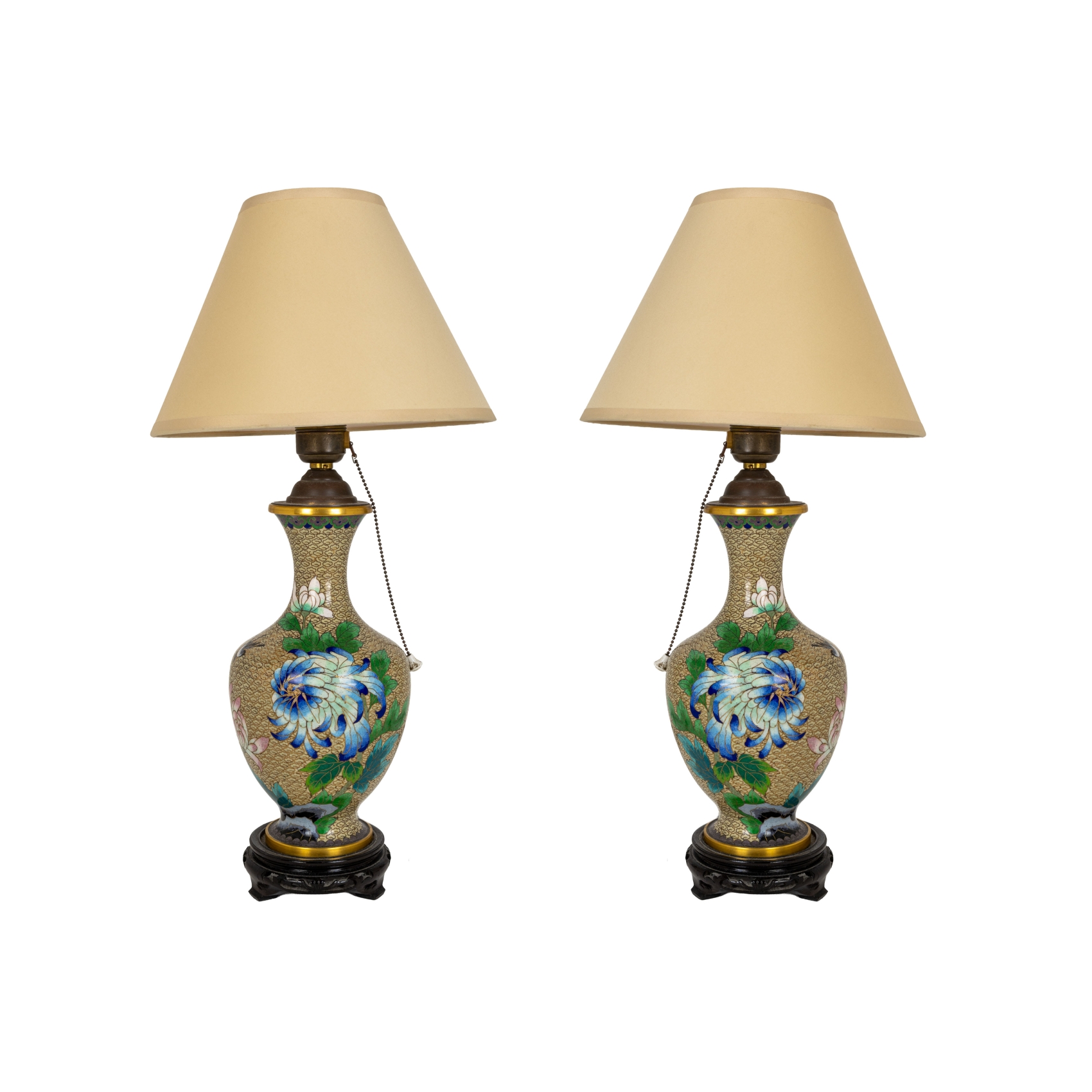 Pareja de lámparas de sobremesa en bronce y esmalte cloisonné con decoración de motivos florales, s.XX. Pantallas tapizadas en tono crema. Apoyan sobre peanas en madera tallada.