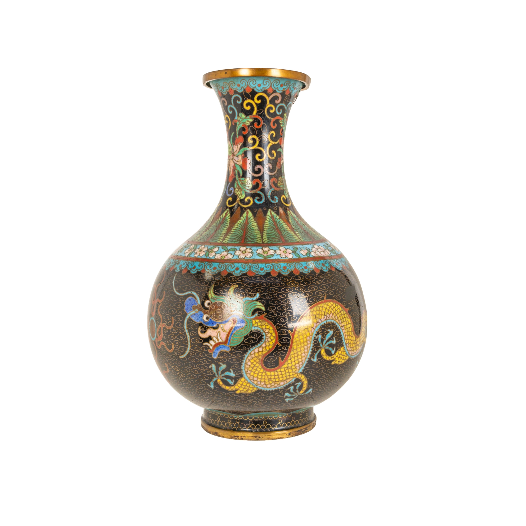 Jarrón chino en bronce dorado y esmalte cloisonné decorado con dragones, flores y motivos geométricos, s.XX.