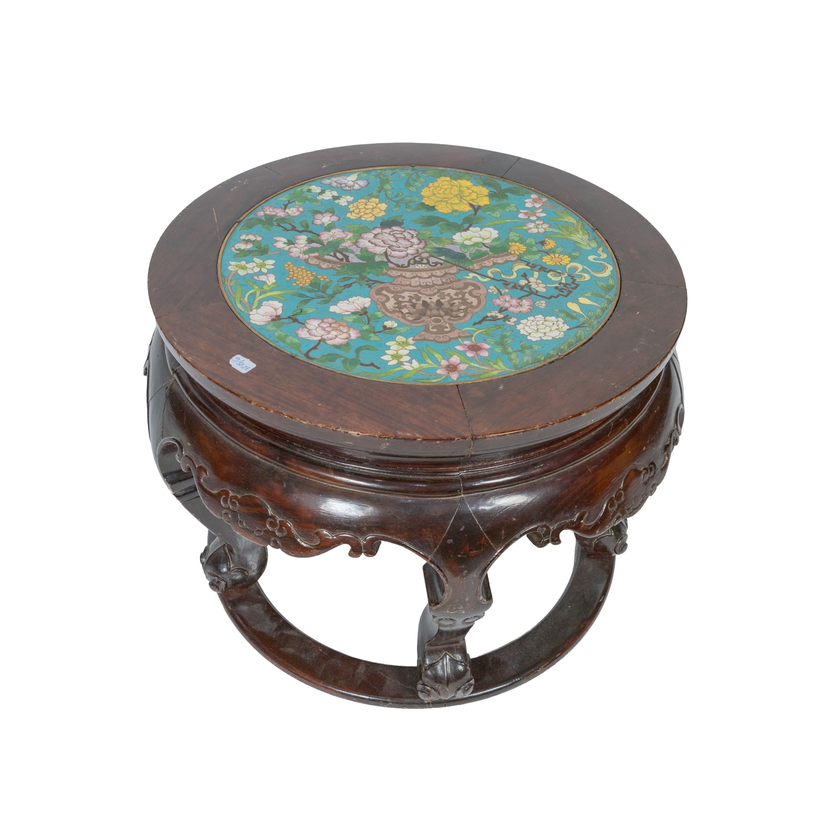 Mesita peana en madera frutal tallada con plato en bronce y esmalte cloisonné con decoración de motivos florales, s.XX.