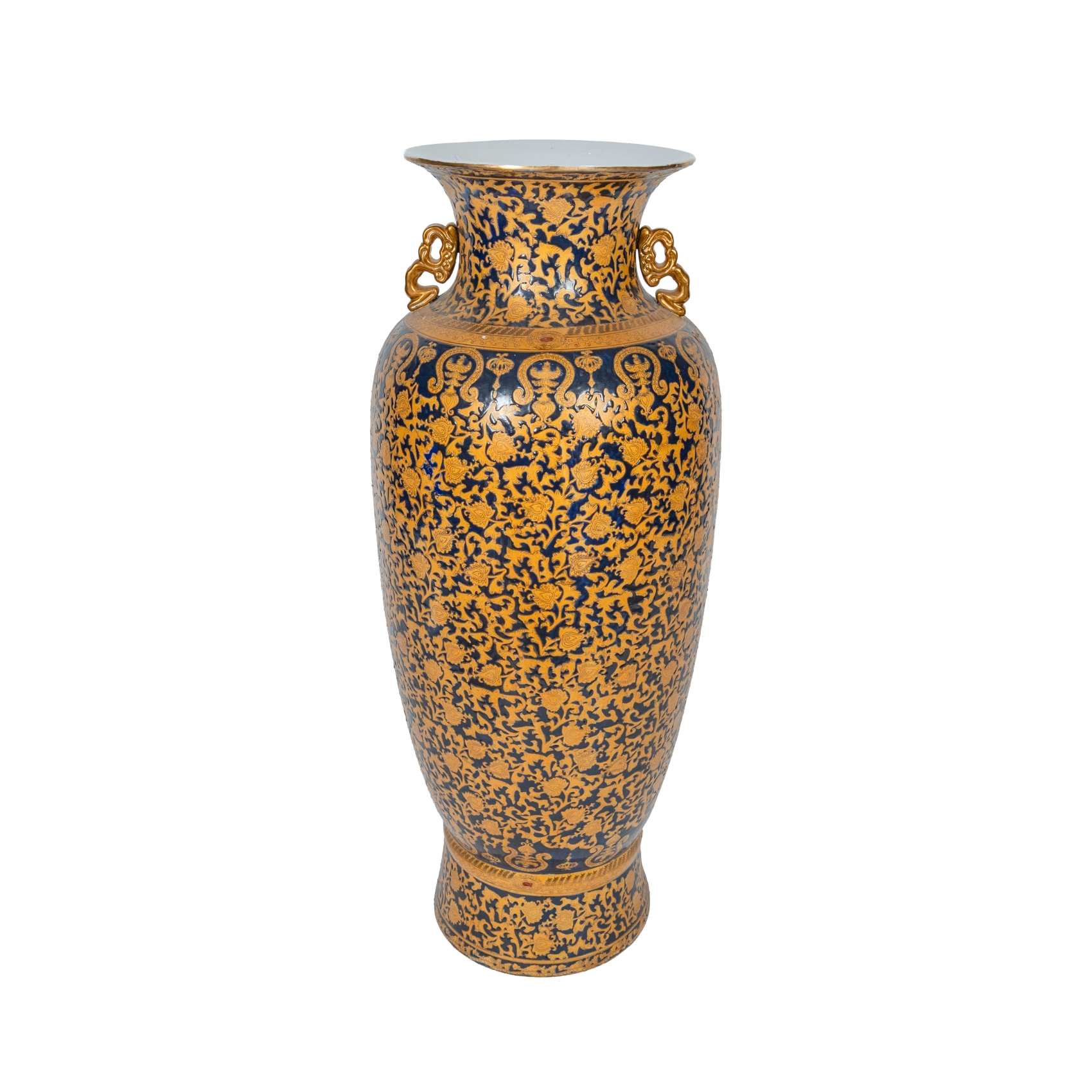 Jarrón oriental en porcelana china con decoración geométrica y vegetal en dorado sobre fondo negro, s.XX. Presenta marca en la base.