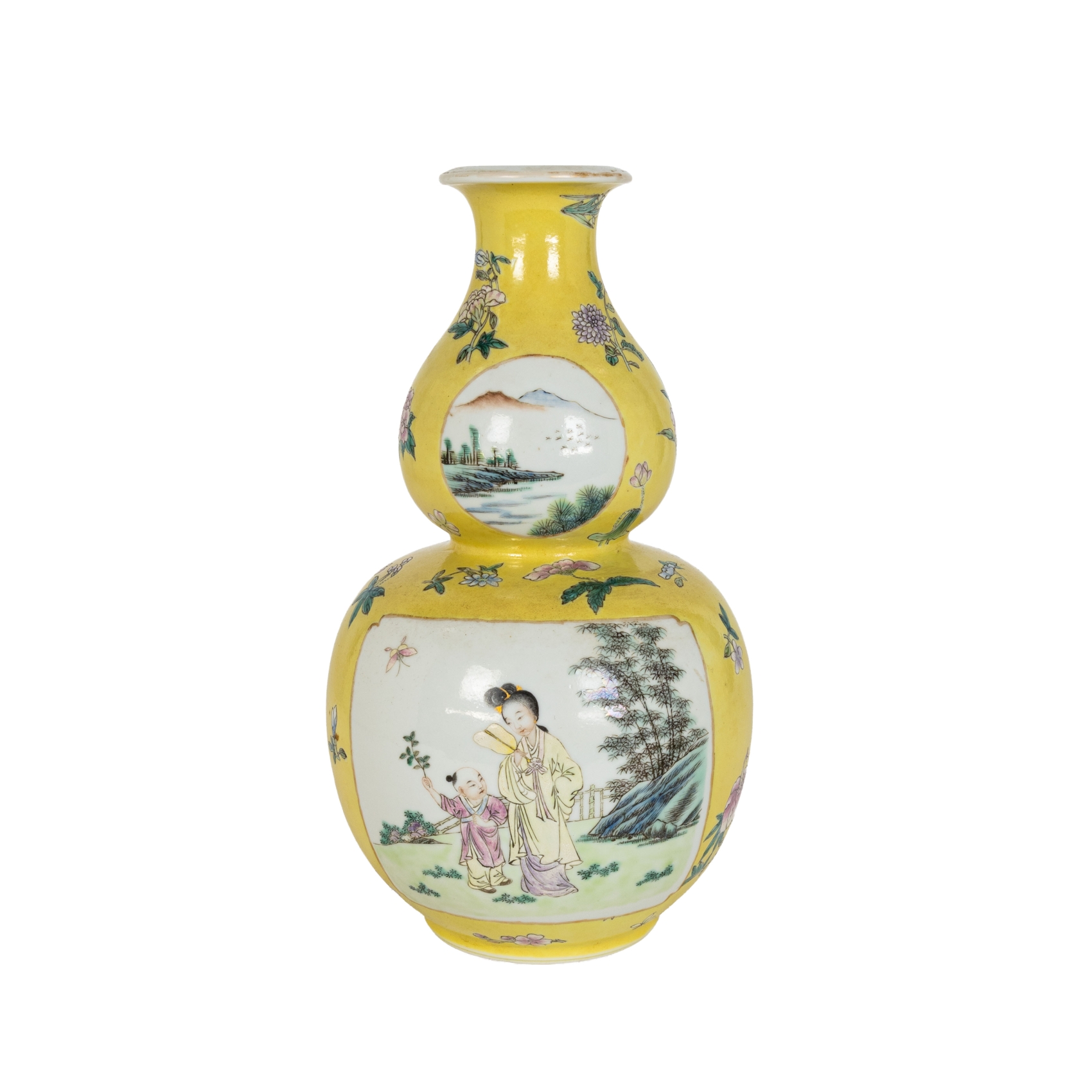 Jarrón chino en porcelana esmaltada con decoraciones florales y escenas cortesanas y de paisajes en cartelas, s.XX.