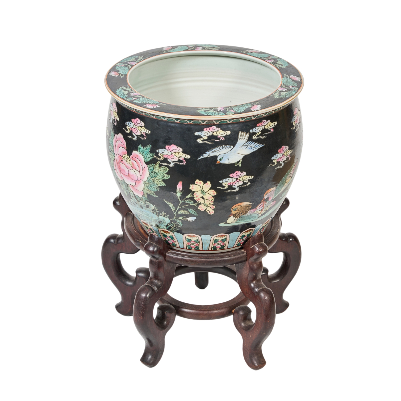 Jardinera oriental en porcelana china Familia Negra con decoraciones esmaltadas de motivos florales y de colibrís, s.XX. Interior esmaltado con decoración de pecera. Apoya sobre peana en madera frutal tallada. Marcas apócrifas en la base.