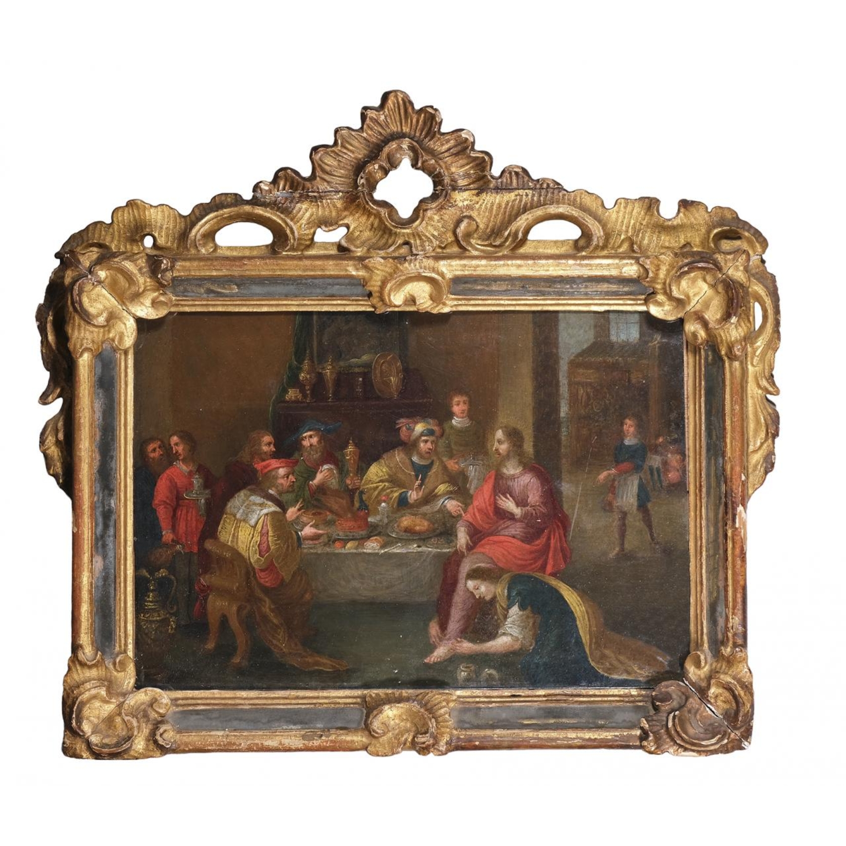 25,5 x 37,5 cm. Presenta marco en madera tallada y dorada con decoración Rococó de rocalla y espejo del s.XVIII.