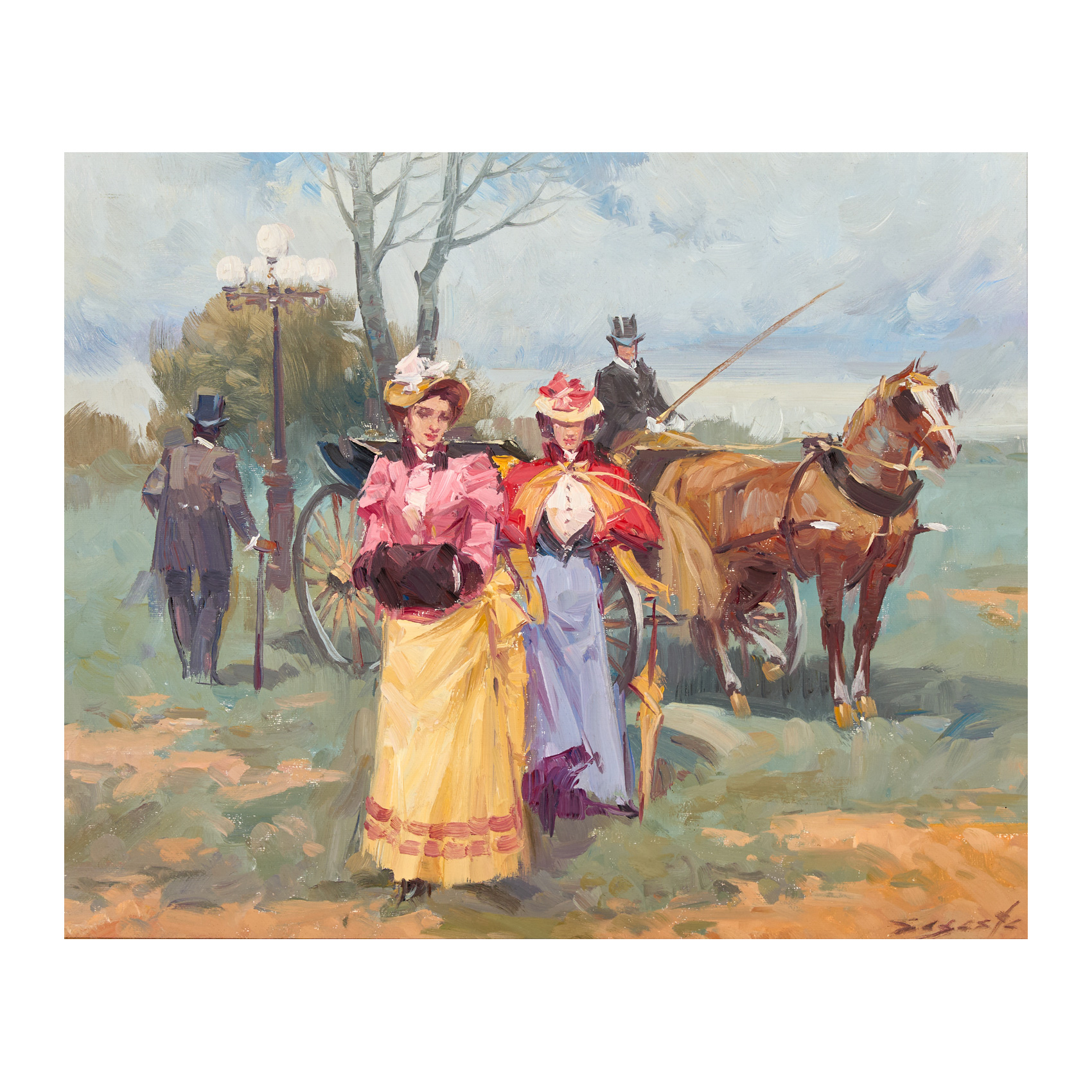 Damas junto al carruaje.