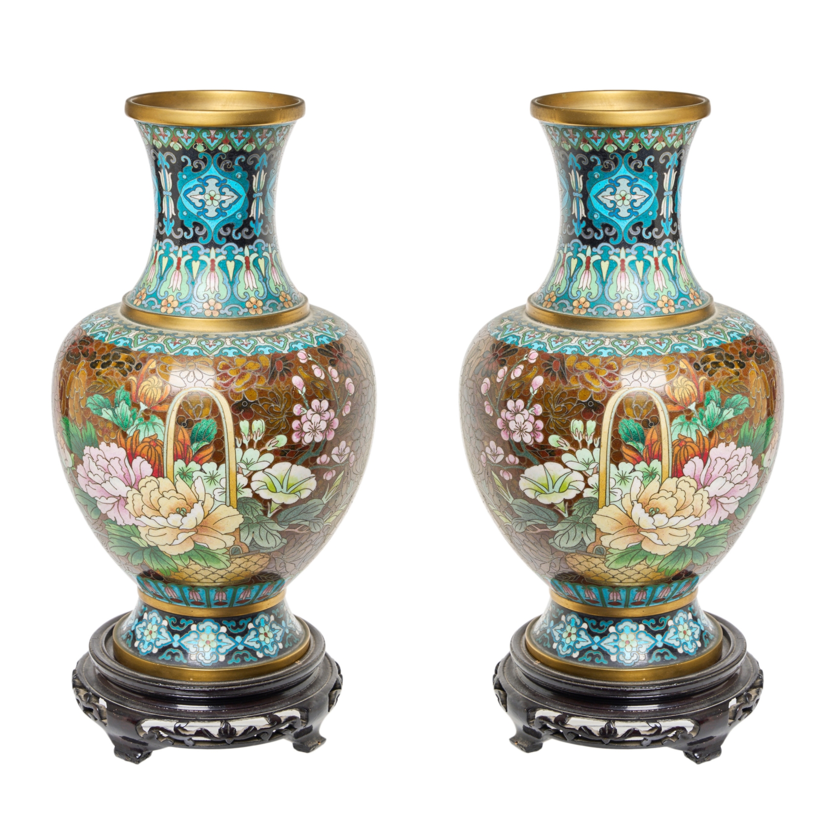Pareja de jarrones chinos en esmalte cloisonné decorados por cestos florales y motivos geométricos, s.XX. Apoyan sobre peanas en madera frutal tallada.