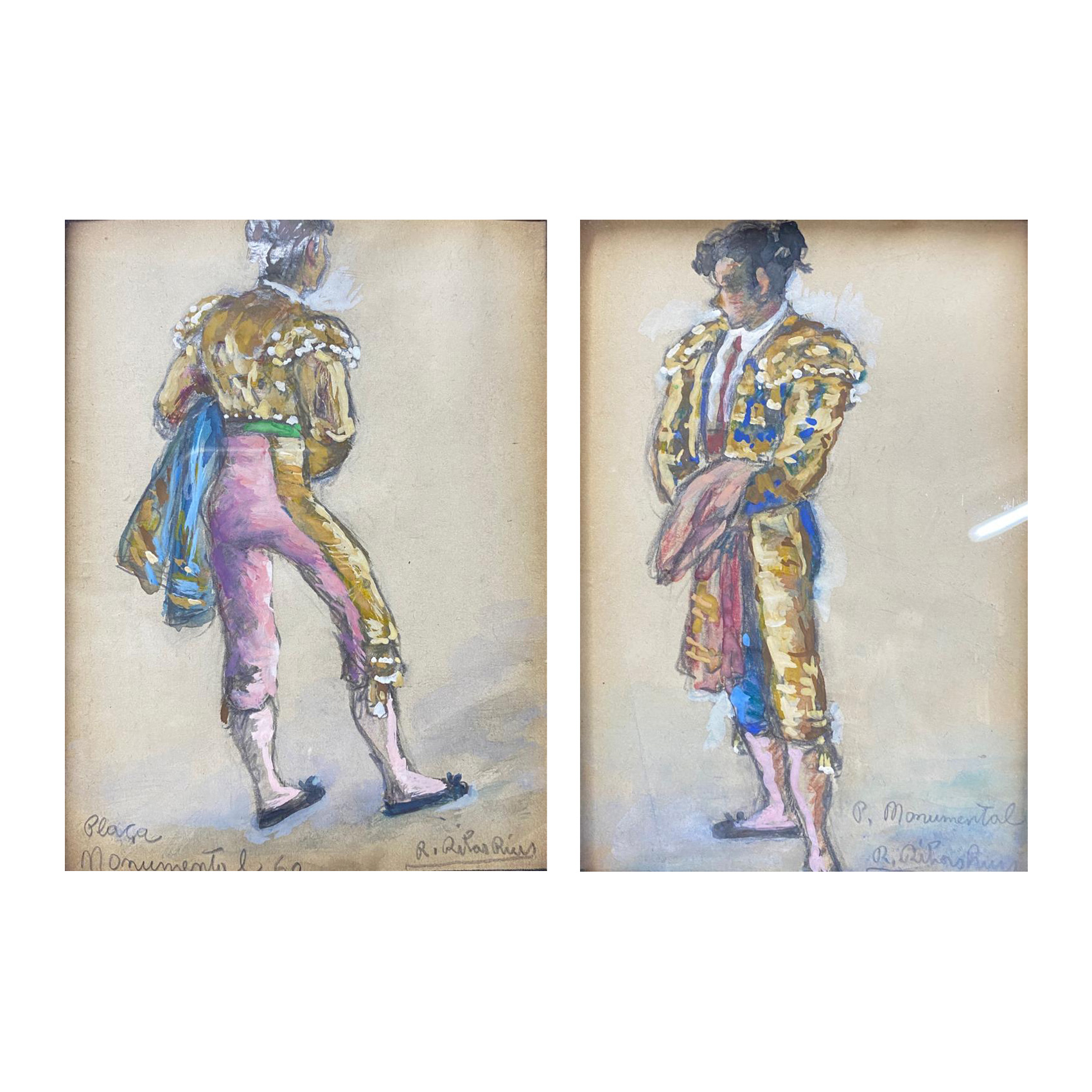 Pareja de técnicas mixtas sobre papel. Firmados y localizados en la plaza Monumental de Barcelona. Fechado uno en 1960.
