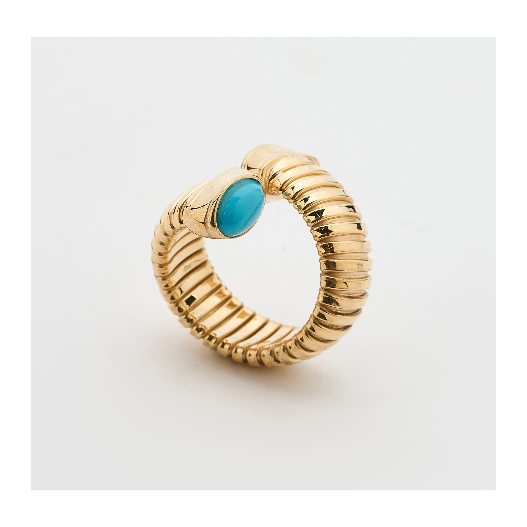 Sortija tubogas en plata dorada con centro abierto y finales rematados por cabujones ovales de turquesa.