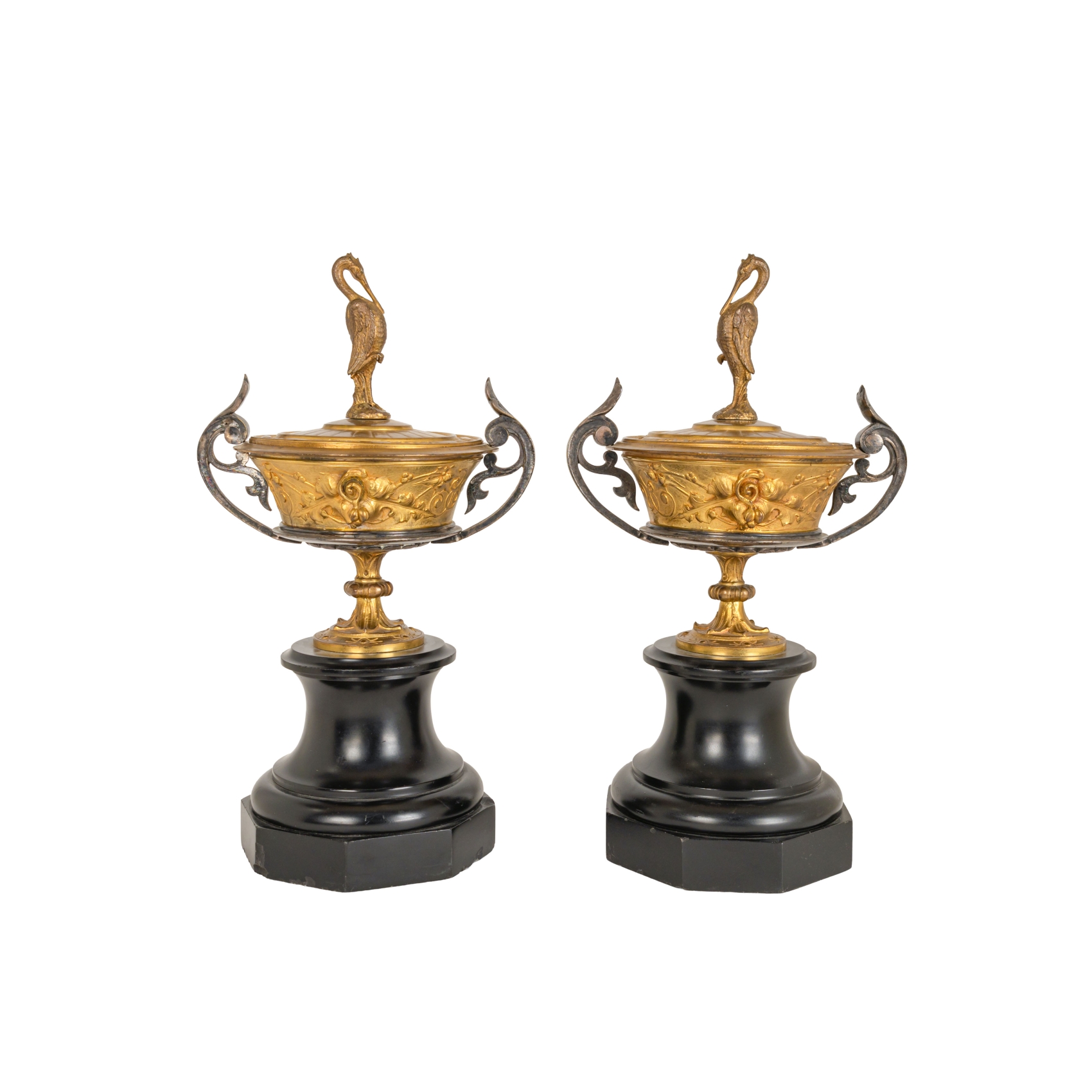 Pareja de copas en bronce dorado con asas en metal patinado y decoración de motivos florales, fles. del s.XIX. Tapas coronadas por ave acuática. Apoyan sobre pequeña base en mármol negro.