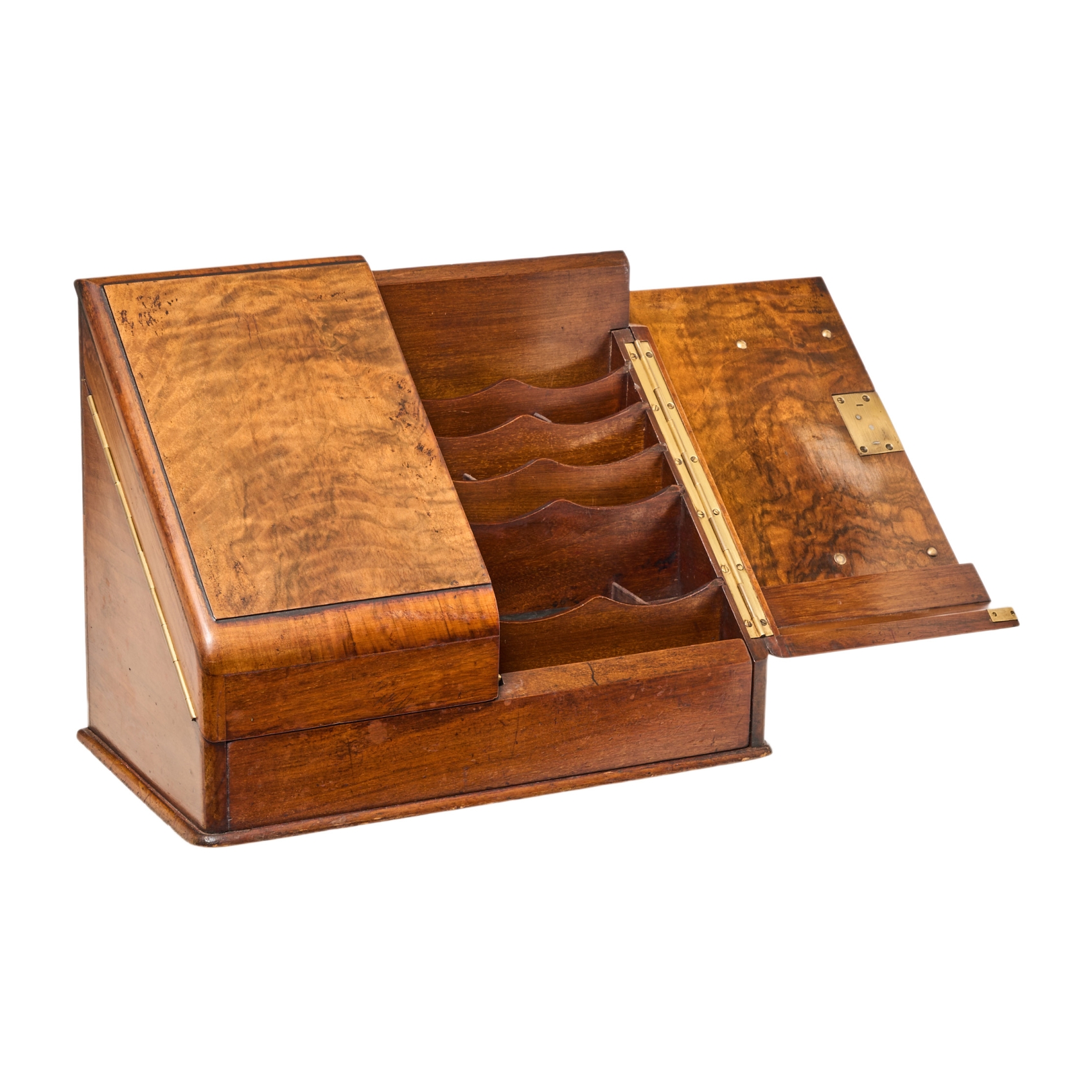Caja archivador victoriano de viaje en madera de nogal, fles. del s.XIX. Frente batiente con interior compartimentado, un tintero en cristal y un cajón inferior. Adjunta llave.
