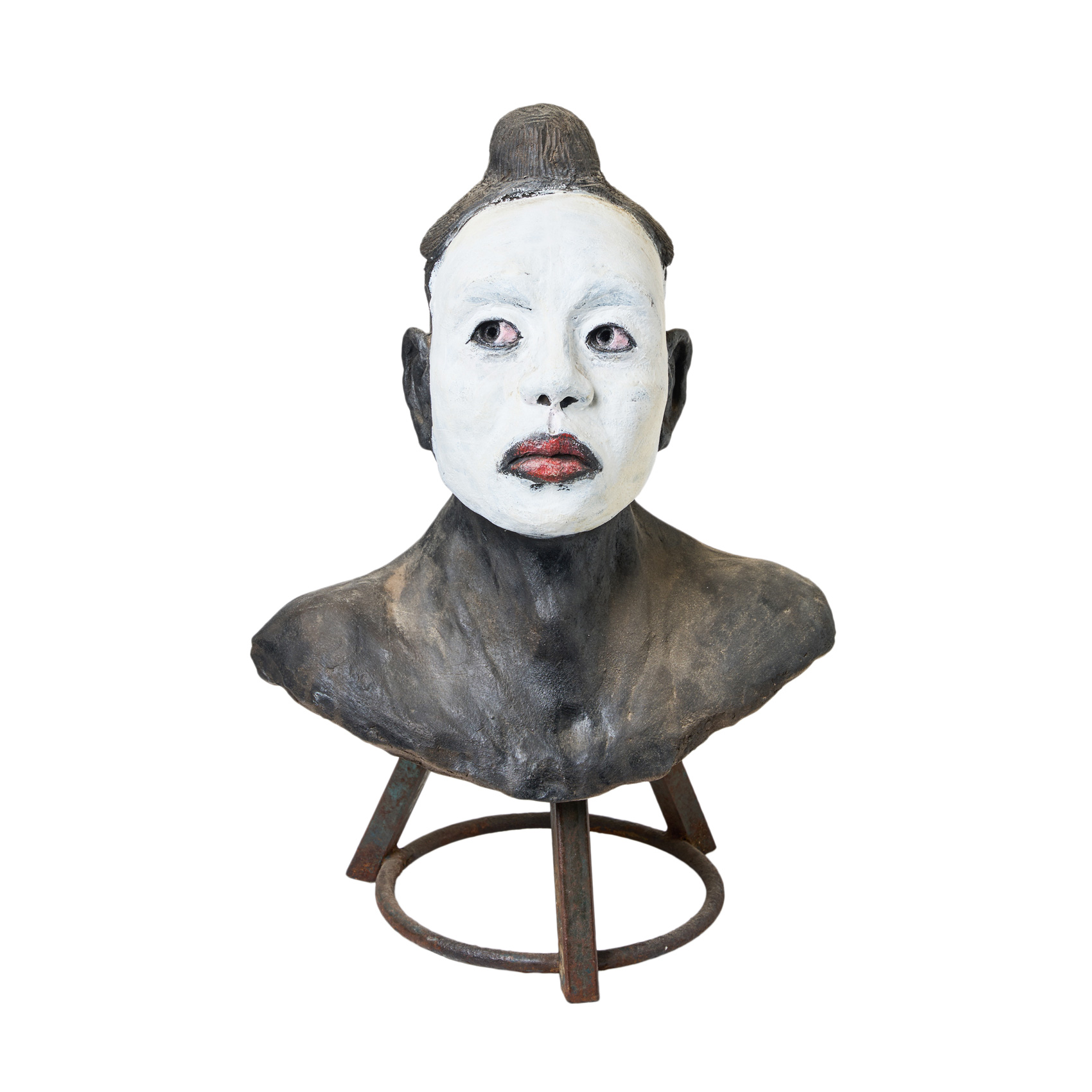 Escultura en terracota policromada. Firmada. Apoya sobre estructura en hierro forjado.