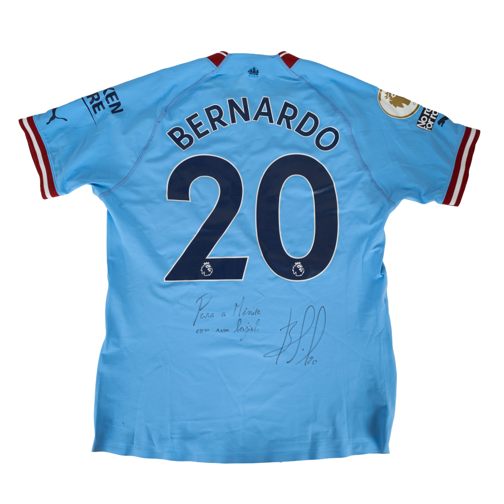 Camiseta oficial de la primera equipación del Manchester City de Bernardo Silva, temporada 22-23 con la que ganaron su primera Champions League. Firmada y dedicada por el jugador. En perfecto estado.