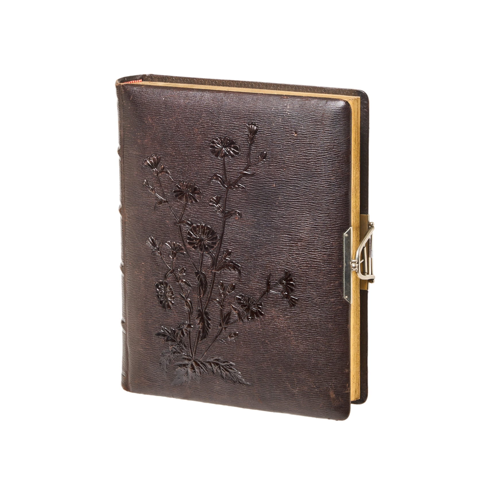 Álbum frances para fotografías tapizado en cuero marrón con decoración floral en relieve, fles. del s.XIX. Interior con fotografías de época.