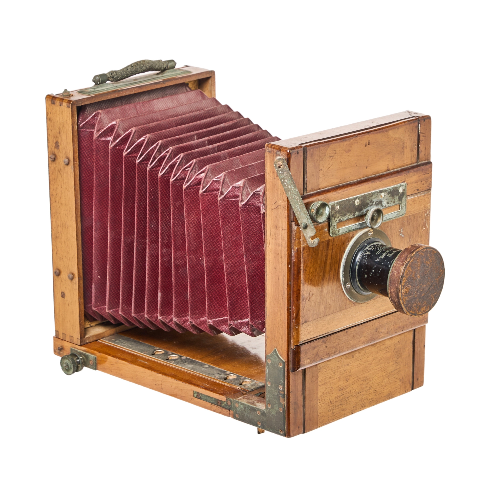 Cámara francesa de placas con fuelle en madera de nogal, c.1920. Lentes distribuidas por Vda. de F. Ros.