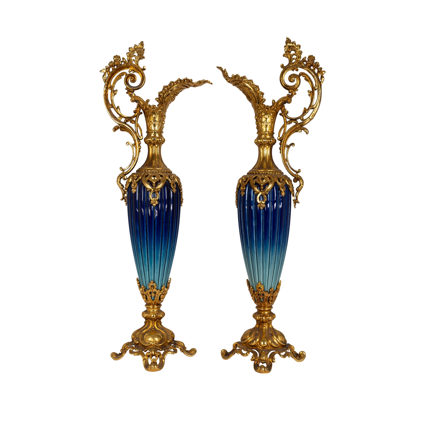 Pareja de jarras estilo neorenacimiento con cuerpo estriado en cerámica esmaltada de tonalidades azules con base y boca en calamina dorada, s.XX.